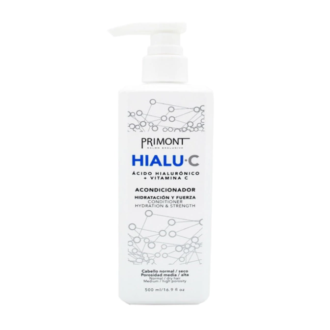 ACONDICIONADOR PRIMONT HIALU C RESTITUYE LA FUERZA INTERIOR Y LA ELASTICIDAD DE LA FIBRA CAPILAR DEBIDO A LA ACCIÓN HIDRATANTE DEL ÁCIDO HIALURÓNICO Y LA PRODUCCIÓN DE COLÁGENO POR LA VITAMINA C. APORTA VOLUMEN Y ELIMINA EL FRIZZ.