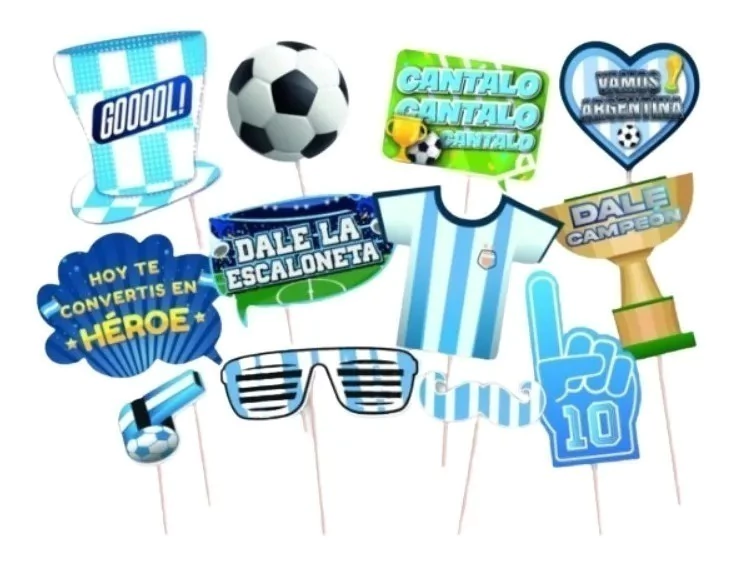 ********************Juanalalo Cotillón*********************************Producto: Adorno para fotos.Cantidad: 12 unidades.Material: Cartón impreso.Personaje: Vamos Argentina Selección .Marca: Otero.