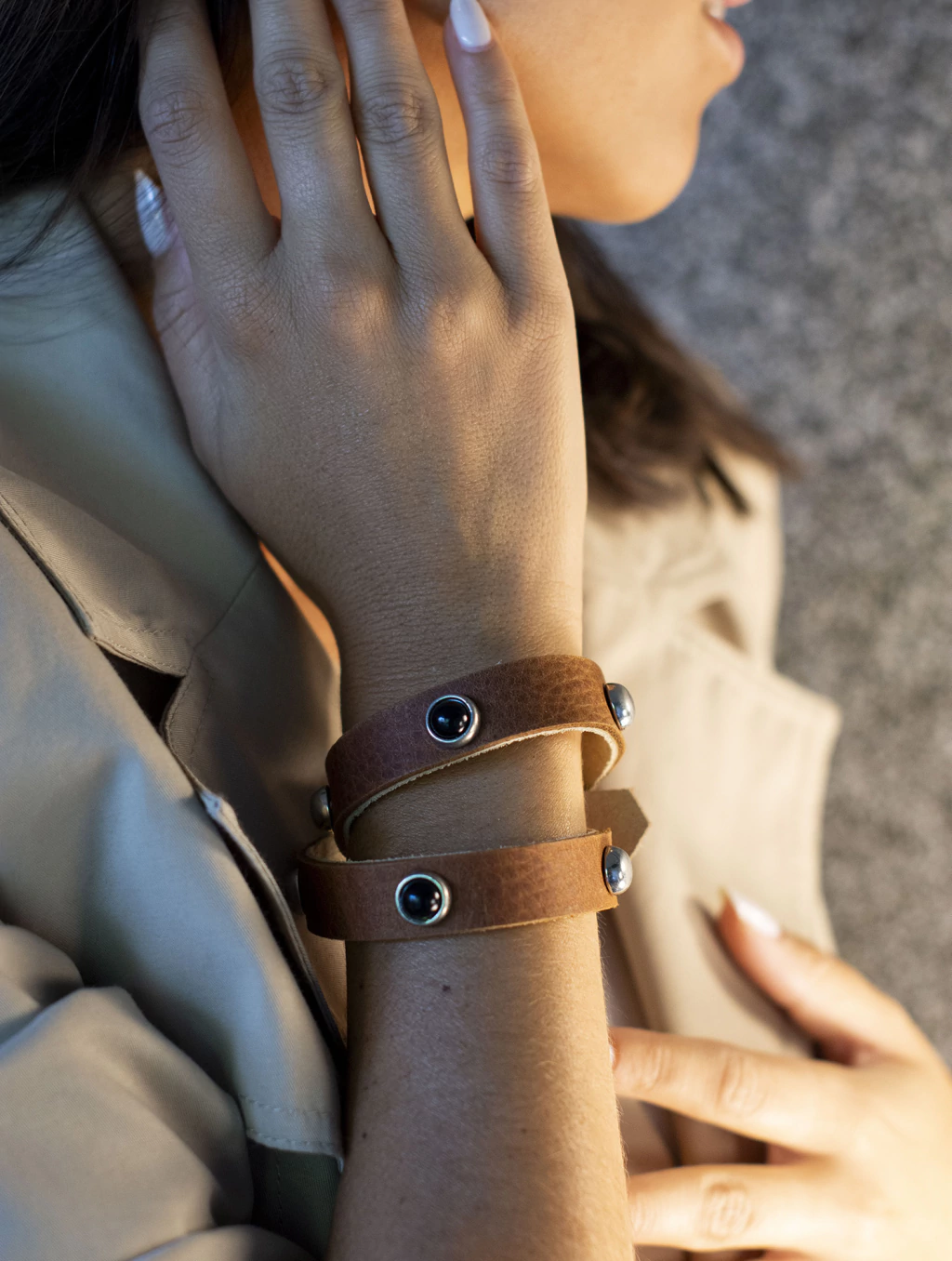 DESCRIPCIÓN:Pulsera de cuero con tachas. Doble.Cierra con broche a presión.Herraje niquel.Medida: 1,5 cm ancho.Confeccionado manualmente por artesanos argentinos.COMPOSICIÓN:Exterior: 100%CUERO Argentino.Las fotografías son a modo ilustrativo y representativas de los cueros. No existen dos cueros iguales, y eso los hace únicos por naturaleza. Los mismos pueden presentar variaciones que reflejan su autenticidad.