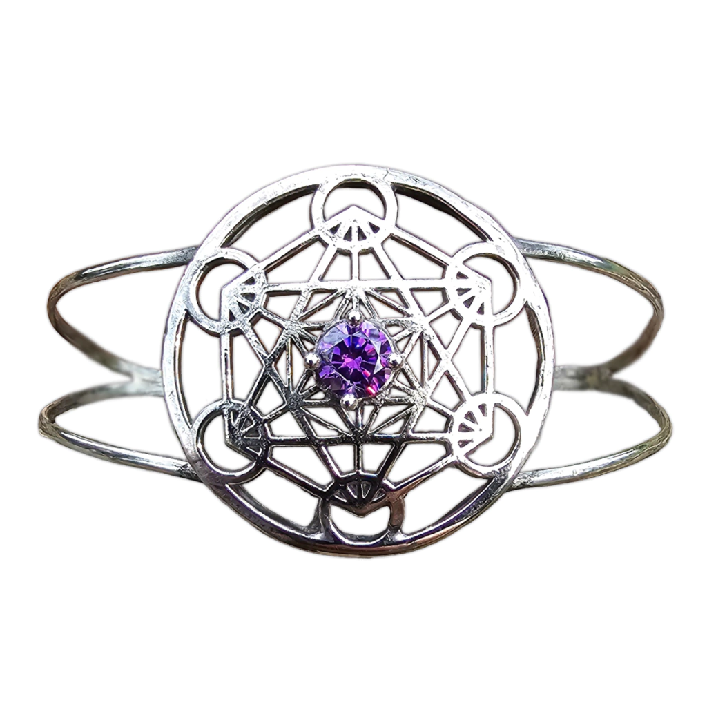 Pulsera Esclava Cubo de Metatron elaborada en Alpaca con Zirconia Cúbica de color a elección. Diseño regulable,