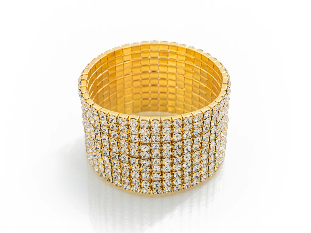 Pulsera de Bijouterie color Dorado, elastizada, con Piedras de Strass Transparentes, 10 hileras. Ancho 3,6cm, diámetro 5,5cm.