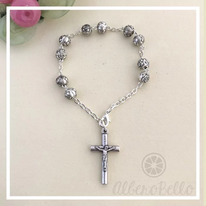 Pulsera fabricada en ItaliaCuentas en plástico metalizadoCuentas en forma de rositasCadena y cruz en zamacDiámetro de las cuentas: 7 mm.Largo del a pulsera (sin considerar la cruz): 18 cm. aprox.Altura de la cruz: 2,5 cm.
