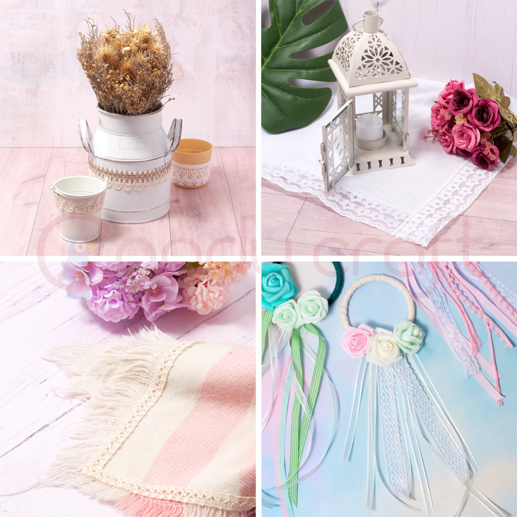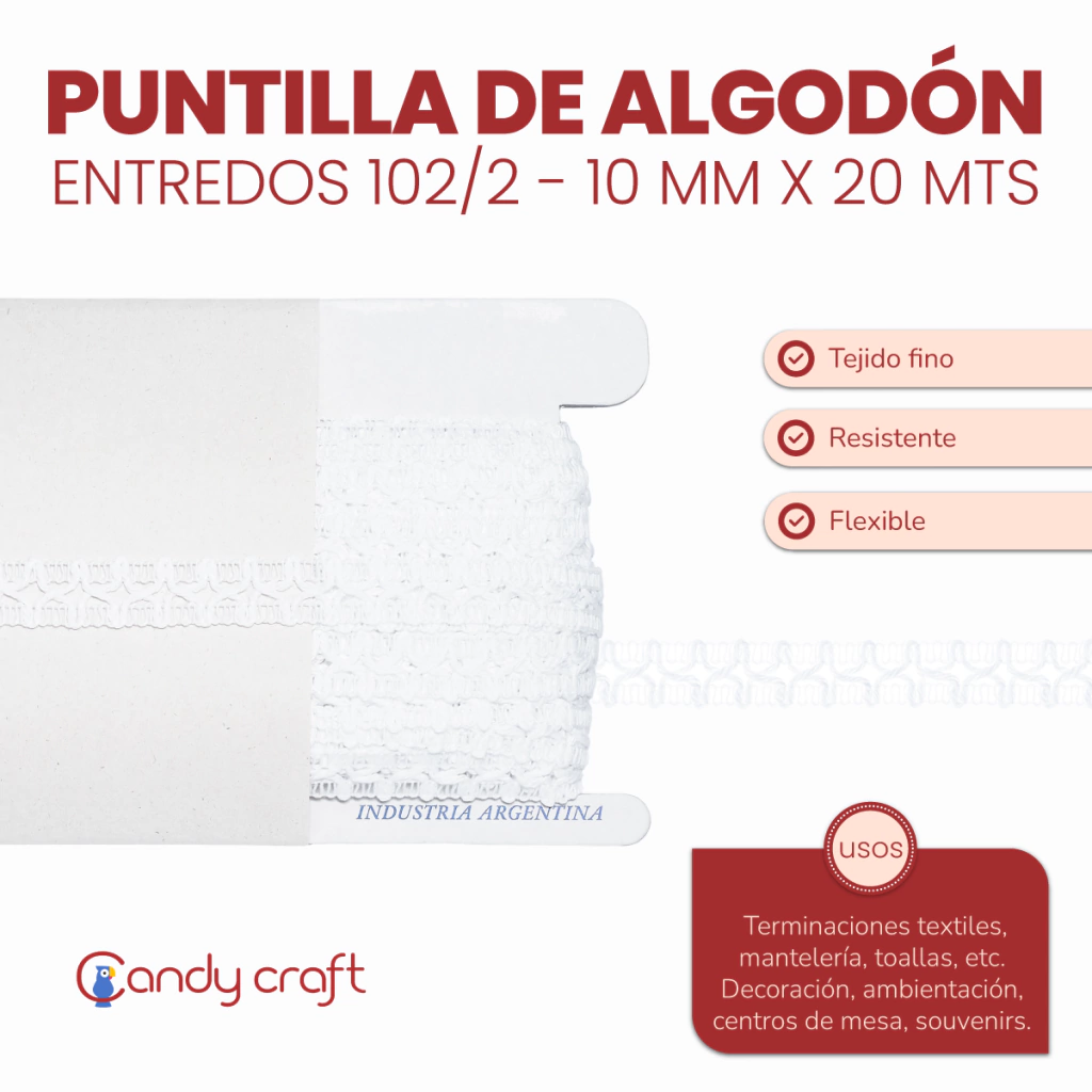 Usos: Terminaciones textiles, mantelería, toallas, etc. Decoración y ambientación, centros de mensa, souvenirs. Entredos da la posibilidad de pasar una fina cinta de color para darle un toque diferente.