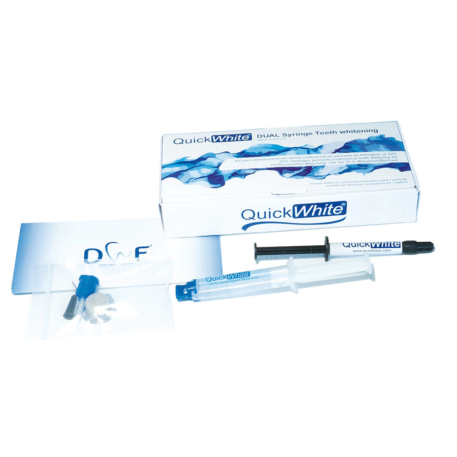 Blanquea ambas arcadas a la vez.El blanqueamiento completo mejora el resultado visible en una sesión de 40 minutos.85 LEDS, sin recambio de bombillas. Luz fría.Eliminación del riesgo de pulpitis y sensibilidades serias.Adaptable a su equipo o con soporte con ruedas.Kits QuickWhite para clínica, aplicando un gel que combinado con la luz consigue una aceleración en el proceso de degradación del peróxido de hidrógeno consiguiendo una mejora de 4 a 12 tonos en una sola sesión.