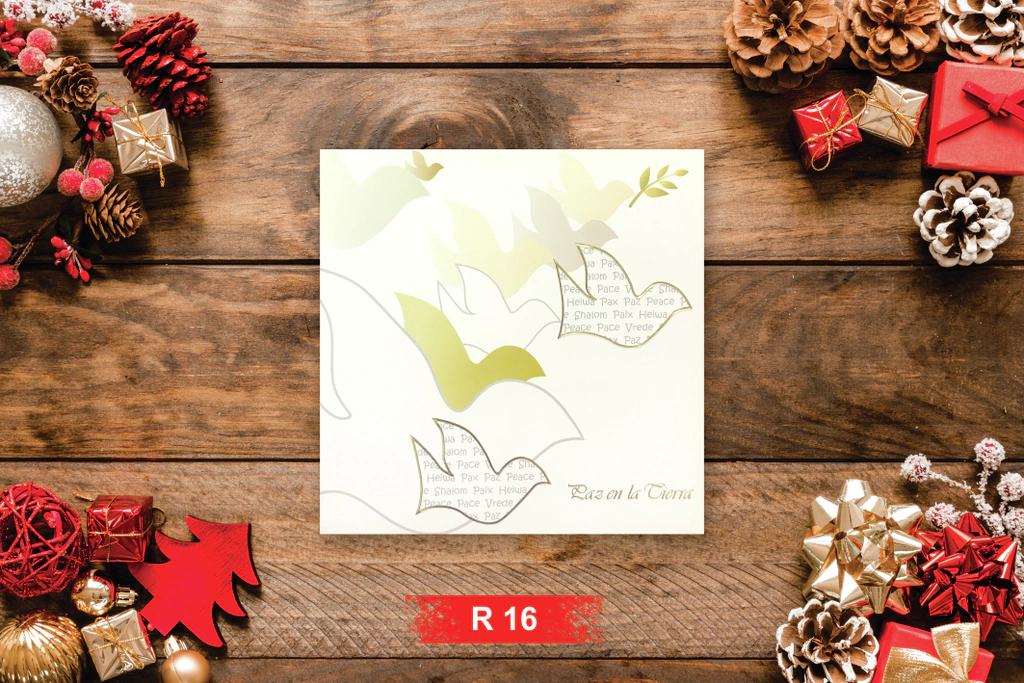 Tarjeta Fin de Año R 16 "Palomas Paz en la Tierra"Medida: 14x14 cmFabricada en Ilustración 250gFormato DípticoImpresión ColorDetalles en Hot Stamping Oro y Relieve* El pack incluye 2 unidades de tarjetas con sus respectivos sobres