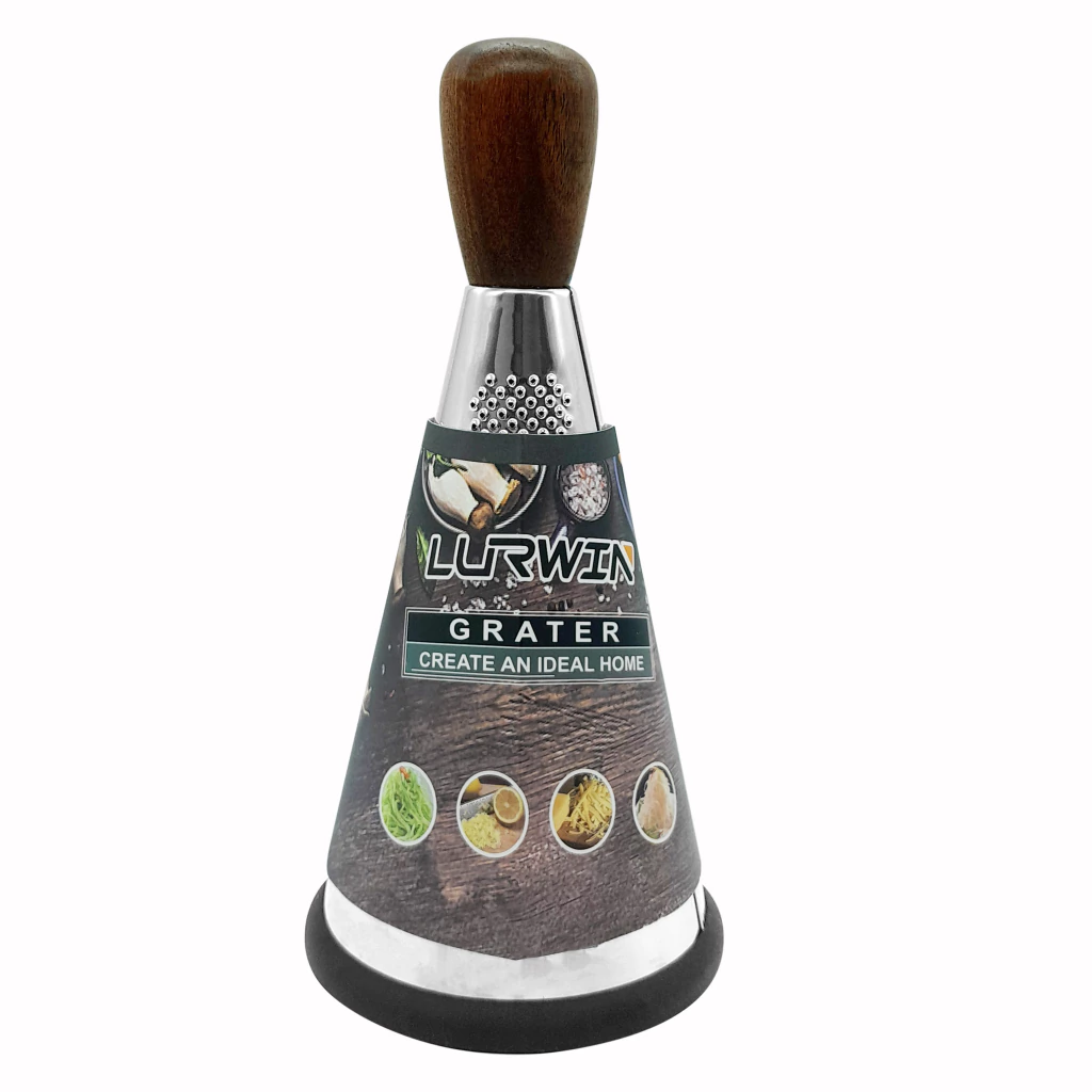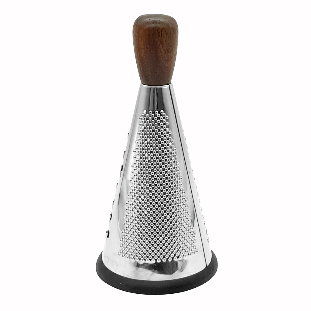 Rallador de Cocina Cónico de acero inoxidable con mango de madera y base de silicona antideslizante.Super práctico para tener en tu cocina, ya no hay mas restos en la mesada de las verduras o el queso que ralles, un forma higiénica y organizada de rallar. De cómodo agarre con su mango de madera para rallar las verduras o el queso, de manera fácil.El rallador de acero inoxidable posee 3 tipos de cortes. Decorativo y práctico para tu cocina.Material: Madera, acero inoxidable y goma de silicona antideslizante en la base.Medidas: 25 cm (alto) x 12 cm (diámetro)