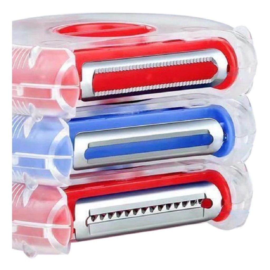 Este utensilio está hecho de un material fuerte llamado acero inoxidable y viene en diferentes colores, como verde, rojo y azul. Con un tamaño de aproximadamente 8.5 x 9 cm, es perfecto para preparar tus comidas más rápido y sin complicaciones. Con esta herramienta, pelar, cortar y rallar se vuelven tareas sencillas en la cocina.