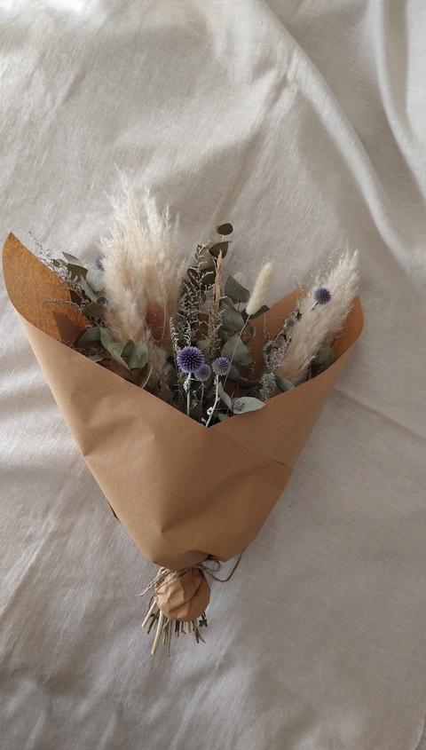 Ramo de flores mixtas con toques de color azul.Tamaños-Chico: 0.45 mts de alto aprox.-Mediano: 0.55 mts de alto aprox.No incluye floreroLa imagen es solo referencial, las flores pueden variar.