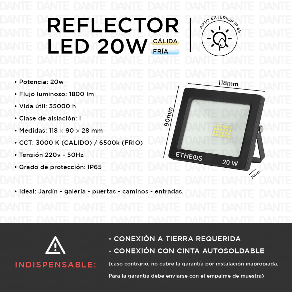 DescripciónREFLECTOR PROYECTOR LED 20W - APTO EXTERIOR• Potencia: 20w• Flujo luminoso: 1800 lm• Vida útil: 35000 h• Clase de aislación: I• Medidas: 118 × 90 × 28 mm• CCT: 3000 K (CALIDO) / 6500k (FRIO)/ Según variante activa• Tensión 220v - 50Hz• Grado de protección: IP65• Color: negro• Ideal: Jardín - galería - puertas - caminos - entradas.INDISPENSABLE:- CONEXIÓN A TIERRA REQUERIDA- CONEXIÓN CON CINTA AUTOSOLDABLE(caso contrario, no cubre la garantía por instalación inapropiada. Para la garantía debe enviarse con el empalme de muestra)VER MAS PROYECTORES**CLICK**---cod.: COMP2884 / COMP2888