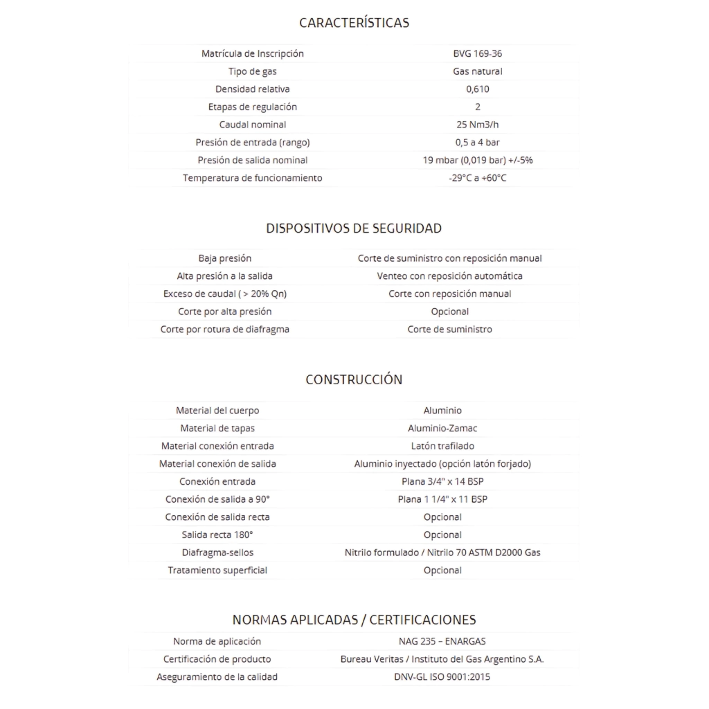 Características- Marca: SALUSTRI.- Linea: 25 metros.- Cuerpo de aluminio.- Material de conexión de entrada: Latón trafilado.- Material de conexión de salida: Aluminio inyectado.- Conector de salida incorporado al cuerpo, evita perdidas.- Tuerca de salida intercambiable, evita desarmar el cuerpo.- Disp. de Seguridad, corte por presión baja o alta.- Caudal 25 Nm3/h.- Presión de entrada 0,5 a 4 bar.- Presión de salida 19 mbar (0.019 bar).- Conexión de Entrada 3/4 IRAM 5063 con junta plana.- Conexión de Salida 1 1/4 IRAM 5063 con junta plana (NAG 235-19).- Matricula de Inscripción: BVG 169-36.- No Incluye Flexible.