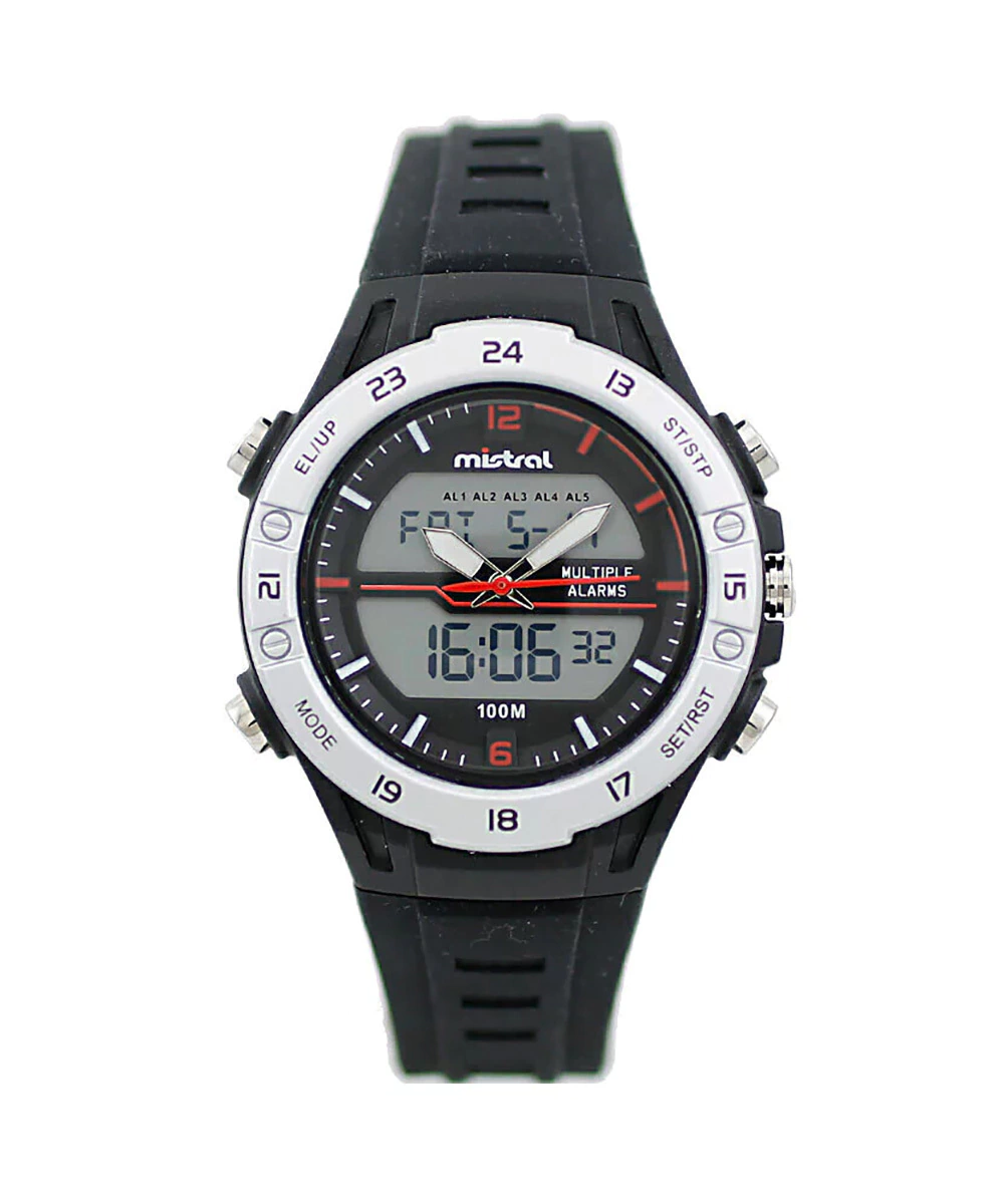 Modelo GADX-VS-01Reloj analogo digitalCaja de plasticoMalla de caucho.Doble hora, digital y analogaCronometroTimer de cuenta regresiva5 alarmasHora dualSumergible 100M6 meses de Garantía OficialCONSIDERACIONES GENERALESLos Relojes se envían con su correspondiente caja, el manual, el certificado de garantía y la factura de compra que hace efectiva la misma.Pasadas 72 de la recepción del producto, debe hacer uso de la garantía oficial, dirigiéndose al servicio técnico oficial por cualquier inconveniente.La firma Watchland, fabricante de los RELOJES MISTRAL no tiene relación con la licencia MISTRAL INDUMENTARIA Y ACCESORIOS DE MODA, son dos licencias distintas sin relación Empresarial.Todas las líneas de comunicación con el servicio técnico están detalladas en el apartado SERVICO TÉCNICO que puede consultar en la sección RELOJESCUIDADO DEL RELOJAntes de usar su reloj lea el manual de instrucciones y tome en cuenta los siguientes consejos:NO prenda la luz electroluminiscente debajo del agua. Los pulsadores NO deben presionarse debajo del agua, para evitar que ingrese agua al reloj, aunque el reloj indique que es sumergible. (Ud. No abriría una puerta para que entre agua porque se inundaría su casa…).NO utilice su reloj en temperaturas extremas ni bajo agua caliente y/ó vapor, ya que daña los circuitos. (Ud. No se ducharía con un aparato electrónico ni lo dejaría dentro del baño…).NO cambie la batería del reloj en cualquier relojería. Cuando necesite cambiarla, recurra al SERVICE OFICIAL AUTORIZADO, porque es el único que garantiza que su reloj siga funcionando normalmente, y bajo las mismas condiciones de fabricación, ya que una vez abierto, este debe ser sellado correctamente para que no pierda su sumergibilidad o hermetismo, ni su garantía. Nunca trate de abrir la caja - tapa posterior por cuenta propia, ya sea de su reloj o banda HRM.La sumergibilidad de su reloj está medida por la presión a la que éste puede someterse, y NO por la profundidad a la que puede sumergirse. (Para mayor información mire el cuadro que se encuentra al pie de estos consejos.).Si su reloj tiene corona a rosca, controle que la misma se encuentre siempre hacia adentro. No tire de la corona hacia afuera cuando el reloj se encuentra debajo del agua.Los relojes con malla de cuero no deben sumergirse, a menos que estuviese específicamente indicado en las instrucciones del reloj.Para limpiar su reloj utilice un paño seco y suave, o un paño suave humedecido en agua con jabón neutro. NO utilice agentes volátiles como bencina, diluyentes, limpiadores en aerosol, etc.No exponga su reloj al contacto con gasolina, solventes limpiadores, pulverizadores, adhesivos, pintura, lámparas de calor, etc.No deje de leer el manual de instrucciones de su reloj, ni la garantía adjunta, para mayor información.