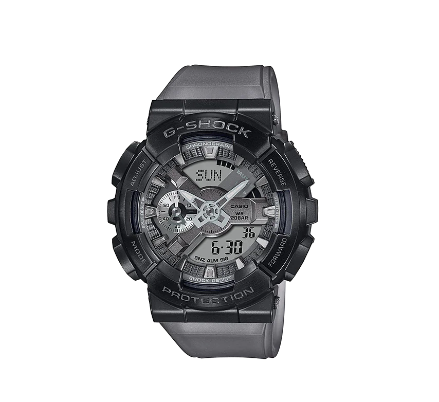 CaracterísticasEl marco de acero inoxidable de este modelo analógico-digital de la serie GM-110 se ha forjado, cortado y pulido para que obtenga su diseño distintivo.El modelo GM-110B está decorado con las piezas de la esfera pintadas en multicolores.EspecificacionesMaterial de la carcasa y el marco: Resina / Acero inoxidableCorrea de ResinaCristal MineralResistencia magnéticaResistente a impactosNeobriteCaja gris con baño de ionesResistencia al Agua de 200 MetrosIluminación por LED (Super Illuminator)Encendido automático de luz, selección de duración de iluminación (1,5 segundos o 3 segundos), persistencia luminosaHorario mundial31 zonas horarias (48 ciudades y hora universal coordinada), horario de verano (activado y desactivado), cambio de hora local a hora mundialCronómetro de 1/100 segundosCapacidad de medición: 999:59'59,99''Modos de medición: Tiempo transcurrido, tiempo de división, tiempos de 1ª y 2ª posicionesTemporizadorUnidad de medida: 1 segundoRango de entrada: de 1 minuto a 24 horas (incrementos de 1 minuto y de 1 hora)5 alarmas diarias (1 alarma con función de despertador)Señal de horaCalendario automático completo (hasta el año 2099)Formato de 12 y 24 horasActivación y desactivación de tono de funcionamiento de botónIndicación clásica de la horaAnalógica: 2 manecillas (hora, minuto [la manecilla se mueve cada 20 segundos]), 1 esfera (indicador de cronómetro)Digital: horas, minutos, segundos, p. m., mes, fecha, díaPrecisión: ±15 segundos por mesDuración aproximada de la pila: 3 años en el modelo SR927W×2CerrarTamaño de la caja/peso totalTamaño de la caja : 51,9×48,8×16,9mmPeso total : 93g