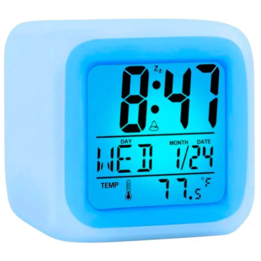 Ideal para no tener que prender la luz para ver la hora!¡Decora tu habitación con este despertador de colores!!!¡Para que disfrutes de esos 5 minutos extras de sueño!CARACTERISTICAS:- Diseño Moderno.- Va cambiando progresivamente de Color.- Emite 6 colores de Luz Led diferentes.- Informa la Hora, la Fecha y la Temperatura ambiente.- Ideal para el cuarto de los chicos- Super Funcional y Decorativo.- Alarma con diferentes sonidos.- Se puede usar como reloj de noche.* MEDIDAS: 7,5 cm. x 7,5 cm. x 7,5 cm.* ALIMENTACIÓN: 3 pilas AAA (no incluidas).* MATERIAL: Plástico.* COLORES LUZ LED: Rojo, Azul, Violeta, Blanco, Amarillo, Verde