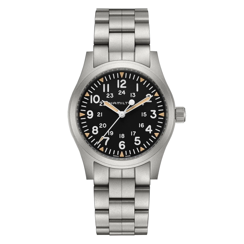 Uno de los relojes más icónicos de Hamilton ahora está disponible con un tamaño de caja más grande. Impulsado por nuestro exclusivo movimiento H-50 de cuerda manual, el Khaki Field Mechanical de 42 mm se mantiene fiel a su forma con una caja de acero inoxidable pulido con chorro de arena y una esfera ultralegible en blanco o negro. Ya sea que use esta versión actualizada del reloj de soldado original con un cómodo brazalete de acero inoxidable o una correa textil verde NATO, su diseño resistente y resistente lo mantendrá a tiempo en cada aventura.El H-50 es un calibre exclusivo desarrollado específicamente para nuestros relojes de cuerda manual. El H-50 está disponible con o sin función de fecha y tiene una reserva de marcha ampliada de hasta 80 horas, lo que garantiza la máxima fiabilidad incluso cuando no se le da cuerda durante unos días.COLECCIÓN: Khaki Field.MODELO: MechanicalREFERENCIA: H69529133MOVIMIENTO: Mecánico - Cuerda H-50ORIGEN: Hecho en Suiza.FUNCIONES: Hora, minutos y segundos. Fecha.FORMA DE LA CAJA: RedondaMATERIAL: Acero inoxidable.TAPA: Cerrada a rosca.CORONA: Cerrada a presión.ESFERA Y AGUJAS: Negro. Números arábigos y manecillas y luminiscentes.CRISTAL: Zafiro resistente a los arañazosCARACTERÍSTICAS: Hasta 80 horas de reserva de marcha.DIMENSIONES: Ø 42.00 mm.PESO: gr.ESTANQUEIDAD: Estanqueidad hasta 5 atm / 50 m (Ducha).BRAZALETE: Correa de acero inoxidable de 22 mm de ancho.HEBILLA: Cierre desplegable con apertura mediante pulsadores.GARANTÍA: 2 años Oficial internacional.