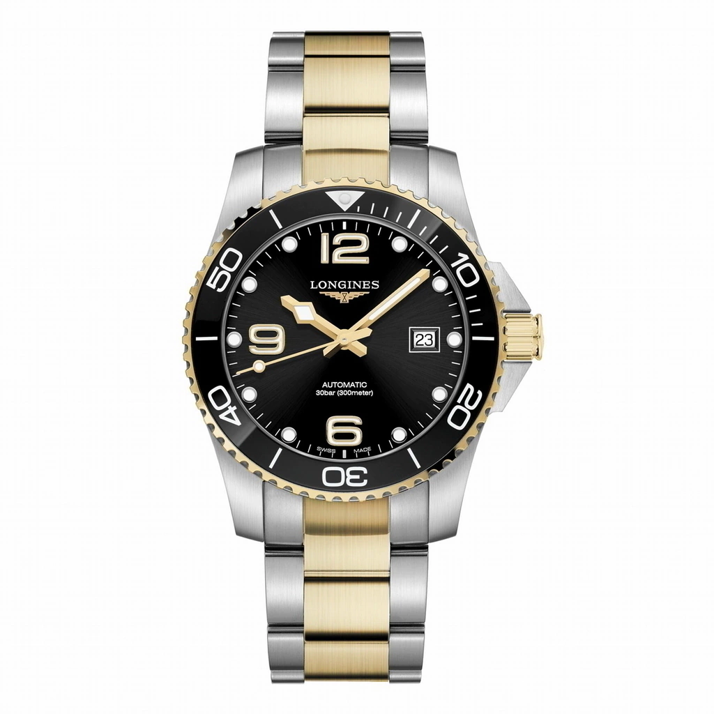 Fundada en 1832 en Saint-Imier, la célebre marca relojera suiza Longines tiene una larga tradición en la que destaca la elegancia de sus productos y su alto rendimiento. Estos valores caracterizan a la colección The Longines Sport Collection, cuya línea HydroConquest ha sido creada especialmente para quienes buscan un reloj que reúna excelencia técnica y elegancia. Longines completa esta colección con nuevos modelos llenos de color.CAJAForma: RedondoMaterial: Acero inoxidable y CerámicaCristal: Cristal de zafiro resistente a los arañazos, con varias capas antireflejos a ambos ladosFondo: Fondo atornilladoDimensiones: Ø 41.00 mmDistancia entre asas: 21 mmGrosor: 11.90 mmEstanqueidad: Estanqueidad hasta 30 barCaracterísticas: Corona a rosca, Bisel giratorio unidireccionalESFERA Y AGUJASColor: Negro con efecto "rayos de sol"Círculo horario: Índices y números árabes aplicadosAgujas: Agujas doradasCaracterísticas: Swiss Super-LumiNovaMOVIMIENTO Y FUNCIONESTipo de movimiento: AutomáticoCalibre: L888Calibre: Movimiento mecánico automático que oscila a una frecuencia de 25.200 alternancias por hora y dotado de una reserva de marcha de 72 horas aproximadamenteFunción: Horas, minutos, segundos y fechaBRAZALETEMaterial: Pulsera de acero inoxidable con revestimiento de PVD amarilloHebilla: Con doble cierre desplegable de seguridad y extensión para buceo integrada