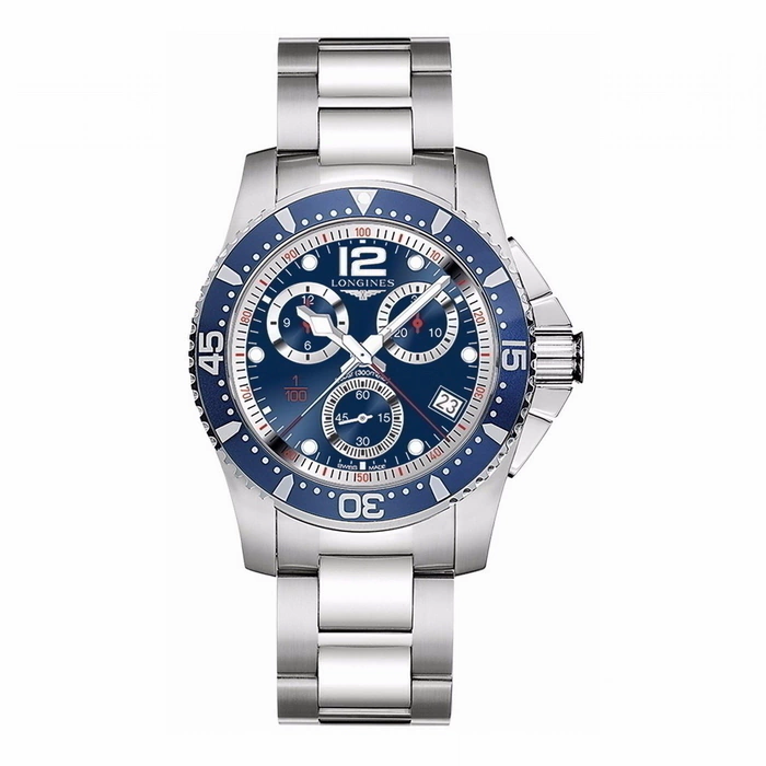Reloj Longines Hydroconquest Chronograph L3.743.4.96.6Fundada en 1832 en Saint-Imier, la célebre marca relojera suiza Longines tiene una larga tradición en la que destaca la elegancia de sus productos y su alto rendimiento.Estos valores caracterizan a la colección The Longines Sport Collection, cuya línea HydroConquest ha sido creada especialmente para quienes buscan un reloj que reúna excelencia técnica y elegancia. Longines completa esta colección con nuevos modelos llenos de color.CAJAForma: RedondaMaterial: Acero inoxidableCristal: Cristal de zafiro resistente a los arañazos, con varias capas antirreflejosDimensiones: Ø 41.00 mmEstanqueidad: Estanqueidad hasta 30 barESFERA Y AGUJASColor: AzulCírculo Horario: Azul. Índices y números árabes aplicados, con Super-LumiNova.Agujas: Agujas plateadas pulidas, con Super-LumiNova ®Características: Bisel giratorio unidireccionalMOVIMIENTO Y FUNCIONESCalibre: Cuarzo L440Función: Horas, minutos, segundos y fecha. Cronografo 1/100BRAZALETEMaterial: Pulsera de acero inoxidableHebilla: Con doble cierre desplegable de seguridad y extensión para buceo integrada.