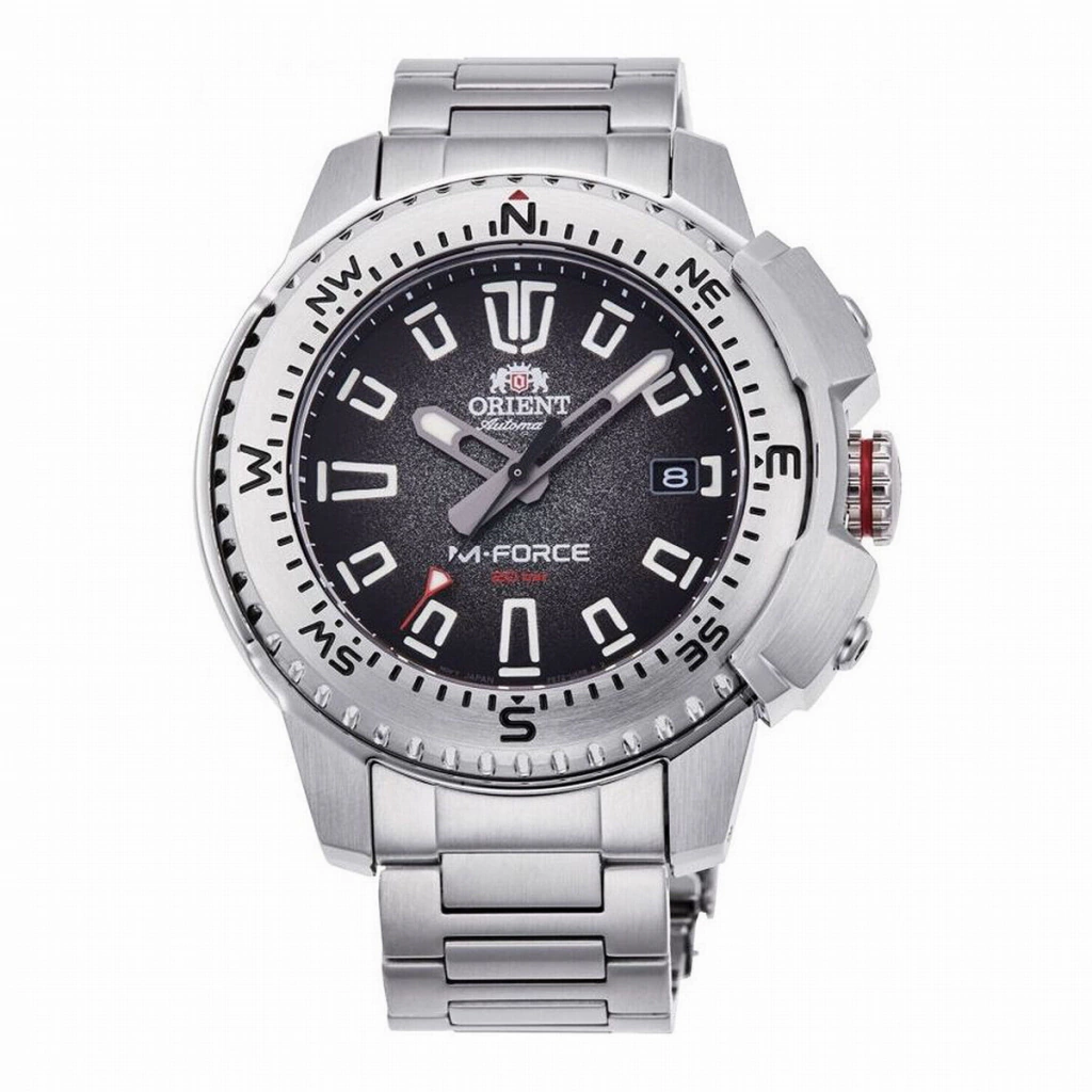 Los nuevos modelos M-FORCE son relojes para buceadores de 200 m con estándar ISO que persiguen la funcionalidad que se espera de un verdadero reloj de aventura, con el calibre interno modificado F6727. También incluyen una gran corona atornillada en la posición de las 3 en punto y un bisel giratorio unidireccional. La novedad de estos modelos es un llamativo protector de caja con una potente forma redonda, que protege la corona atornillada y el bisel de golpes o presiones externas. El resistente bisel giratorio unidireccional es protector, y está grabado con nuevas fuentes numéricas rediseñadas para que coincidan con el nuevo logotipo de M-FORCE. La esfera, vista a través de un cristal de zafiro con una capa antirreflectante, tiene índices en relieve para una apariencia tridimensional, recubierta con una fuerte luz luminosa para garantizar una excelente visibilidad, una característica esencial de cualquier reloj de buceo. También es nuevo el brazalete de metal. Sus sólidos y resistentes enlaces finales se conectan firmemente a las poderosas orejetas para integrarse perfectamente con el estuche. Los enlaces están dispuestos en un paso más corto para mayor comodidad.