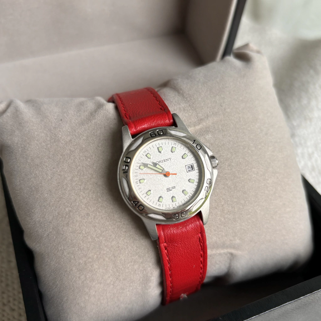 Reloj Orient para dama. Correa de cuero rojo. Calendario.