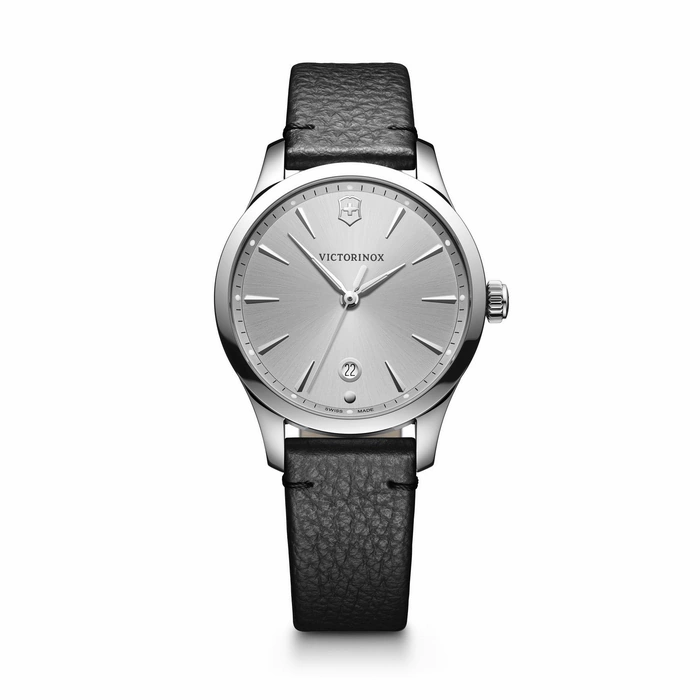 Reloj Victorinox Alliance Small 241827 Mujer | Original Agente OficialEn el Alliance el equilibrio sofisticado realmente se hace presente. Es un reloj dinámico y decisivo que no pierde la delicadeza. Perfecto para las mujeres detallistas a las que les gusta la estética clásica en sus accesorios. Conservará este reloj en su colección por décadas. El acabado cepillado de la esfera y los elegantes marcadores con forma de flecha acentúan sutilmente su bello contorno curvo. Una obra maestra con forma femenina.-COLECCIÓN: Alliance Small.-REFERENCIA: 241827-ORIGEN: Hecho en Suiza-MOVIMIENTO: Cuarzo-FUNCIONES: Hora, minutos, segundos. Fecha.-FORMA DE LA CAJA: Redonda.-MATERIAL: Acero inoxidable 316L.-ESFERA Y AGUJAS : Plateada. Indicadores y manecillas plateadas.-CRISTAL: Zafiro antirreflectante con triple recubrimiento a prueba de rayaduras-CORONA: Cerrada a presión.-TAPA: Cerrada a rosca.-CARACTERÍSTICAS: Indicador de fin de la vida util de la batería E.O.L.-PESO: 41.5 gr.-DIMENSIONES: Ø 35.00 mm x 8.10 mm de espesor.-ESTANQUEIDAD: Estanqueidad hasta 10 atm / 100 m / 330 pies.-BRAZALETE: Correa cuero negro de 17 mm de ancho.-HEBILLA: Hebilla Tradicional.-GARANTÍA: 5 años Oficial internacional.
