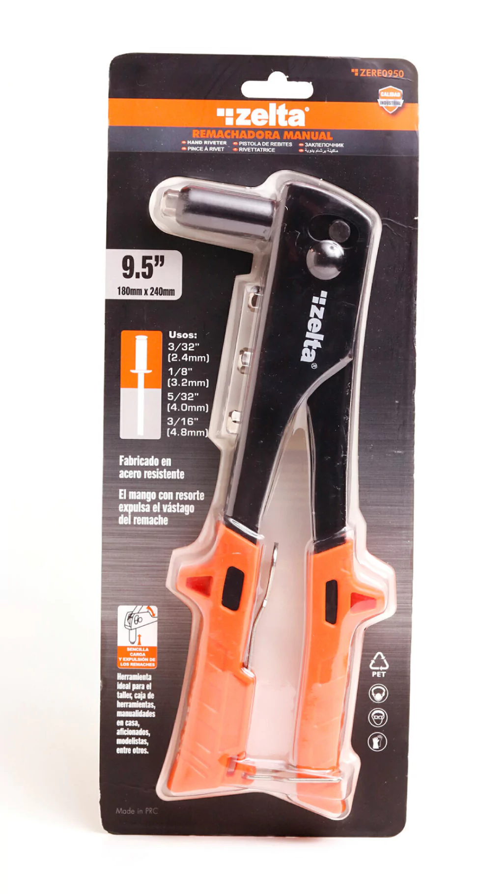 SKU: 40132Remachadora Manual 4 Boquillas Zelta 240mm Uso IntensivoMejora tus proyectos de trabajo con laRemachadora Manual Zelta, una herramienta diseñada para ofrecereficiencia y durabilidaden tareas de remachado. Ideal para profesionales y aficionados, su construcción robusta la convierte en un elemento esencial en tu caja de herramientas.Características:Boquillas Versátiles: Incluye4 boquillasde diferentes medidas (2.4mm, 3.2mm, 4.0mm, 4.8mm), adaptándose a diversas aplicaciones.Longitud Ideal: Con una longitud de240mm, esta remachadora permite un manejo cómodo y preciso en cada uso.Uso Intensivo: Diseñada para soportar trabajos exigentes, garantizando resultados óptimos en cada tarea.Beneficios:LaRemachadora Manual Zeltano solo facilita el proceso de remachado, sino que también mejorala eficiencia en tus proyectos diarios. Experimenta la calidad y precisión que solo Zelta puede ofrecerte.¡No te pierdas la oportunidad de adquirir esta herramienta indispensable!Hazte con la Remachadora Manual Zelta de 240mm hoy mismoy lleva tus trabajos al siguiente nivel.