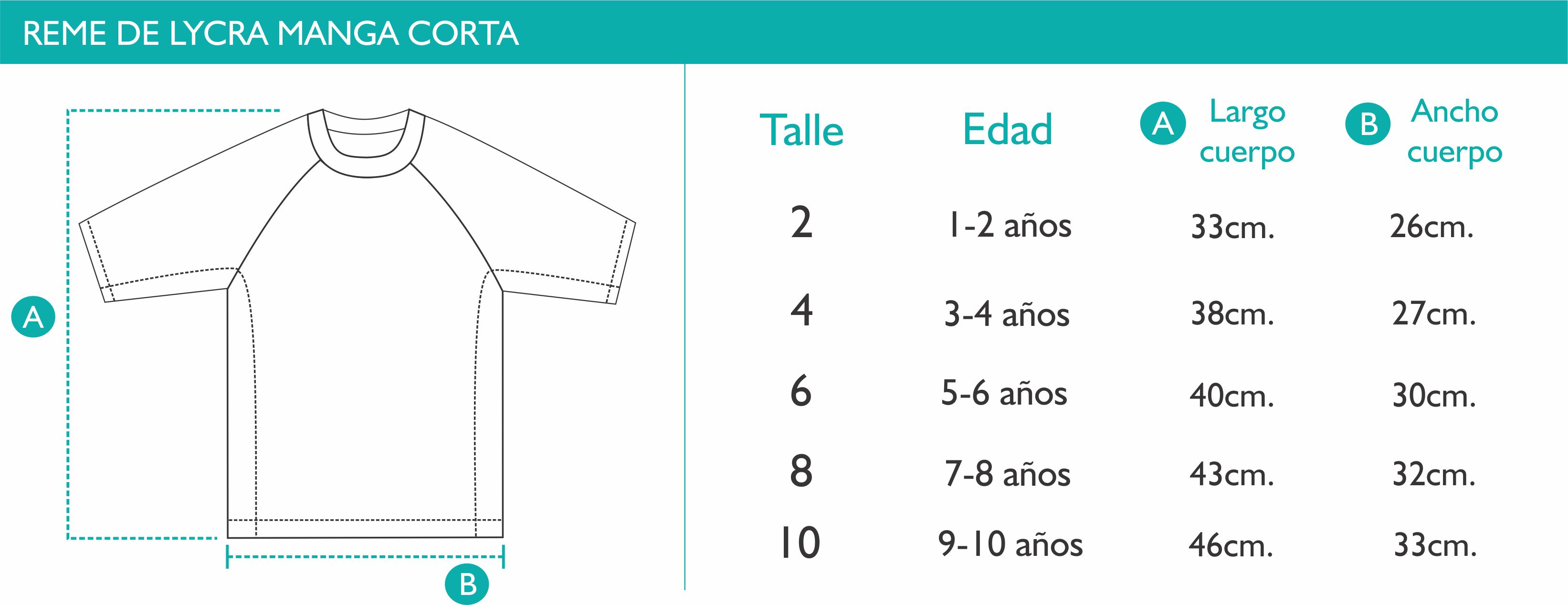 Lo ideal es medir una malla/ remera que tengan que le quede bien al niñ@ desde el hombro hasta abajo y comparen la medida con la tabla que ven arriba. Cualquier duda pueden consultarnos, tambien tienen un video explicativo en Instagram y en la página de la tienda que dice medidas 😉