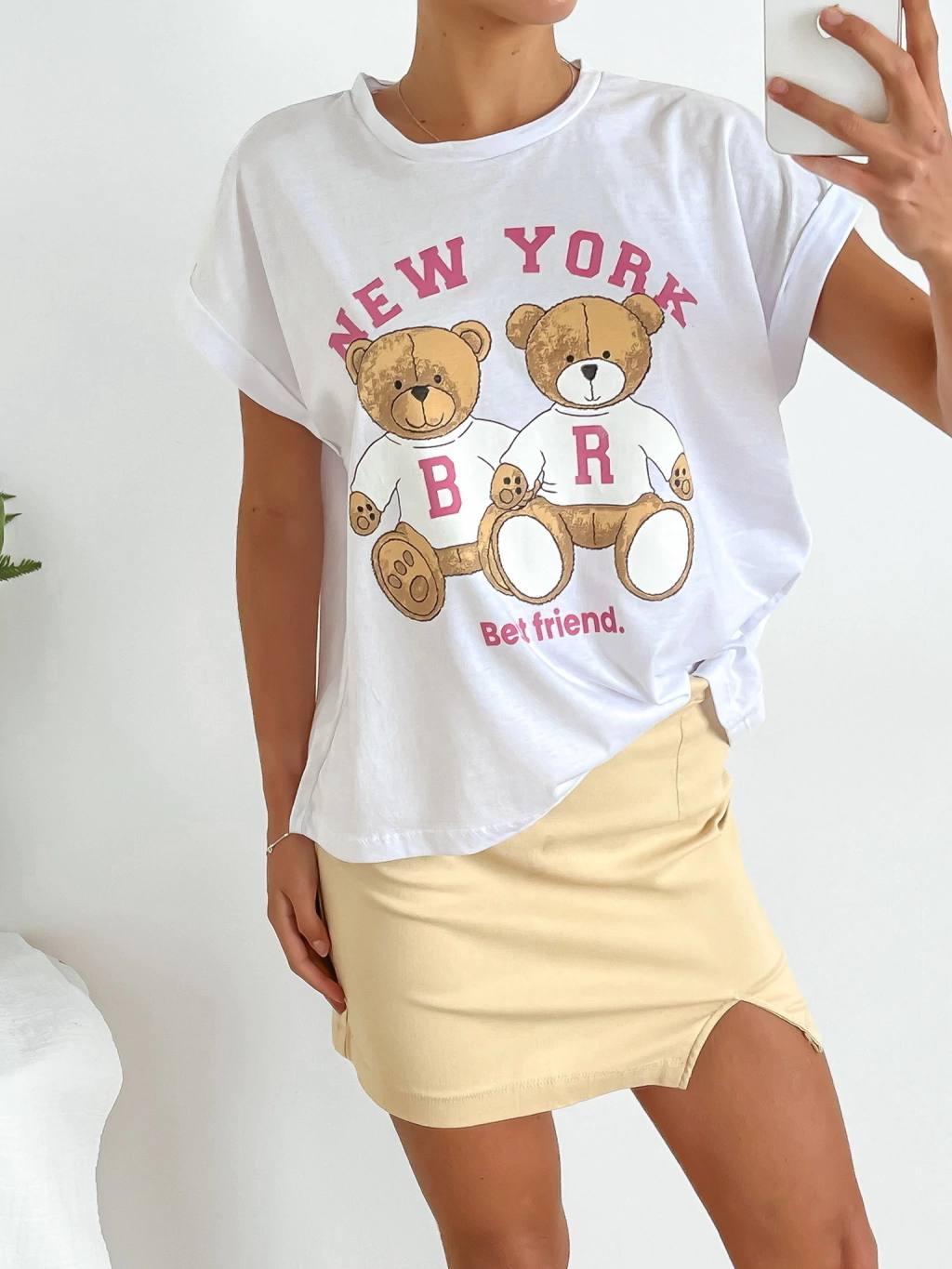 Remera amplia manga rebatible New yorkEscote: RedondoLongitud: A la caderaTipo de ajuste: AmplioTejido: Elastiza hasta un 15% más que las medidas publicadasMaterial: JerseyComposición: 100% algodonInstrucciones de Cuidado: Lavar a mano con agua fría y jabón suave. No retorcer. No centrifugar. NO PLANCHAR SOBRE ESTAMPADetalles: Estampa en delanteroMedidas: Las medidas son aproximadas, pueden variar algunos cms.TALLE ÚNICOMEDIDAS: ANCHO DE SISA A SISA: 59 CM / LARGO: 56 CMMEDIDAS DE LA MODELOMartuContorno de busto: 82 cmContorno de cintura: 59 cmContorno de cadera: 88 cmAltura: 1,65 mts