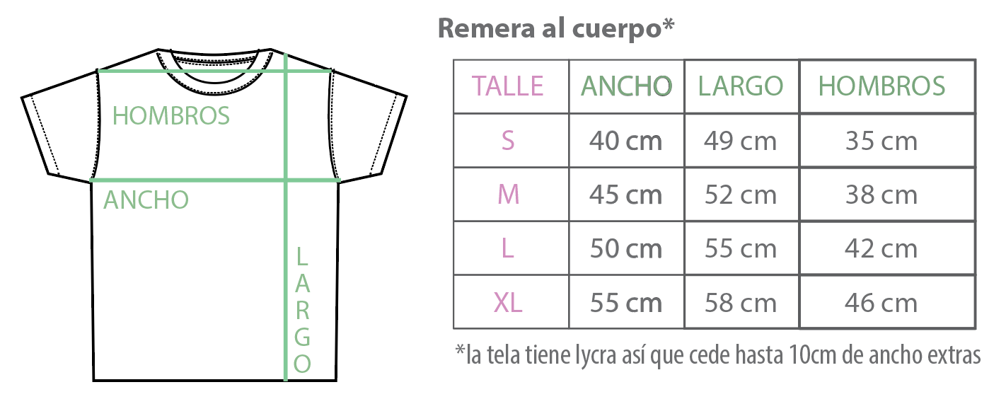 Para elegir tu talle te recomendamos medir una prenda tuya del estilo como muestra la figura y compararla con la tabla (las medidas corresponden a la prenda sin estirar)