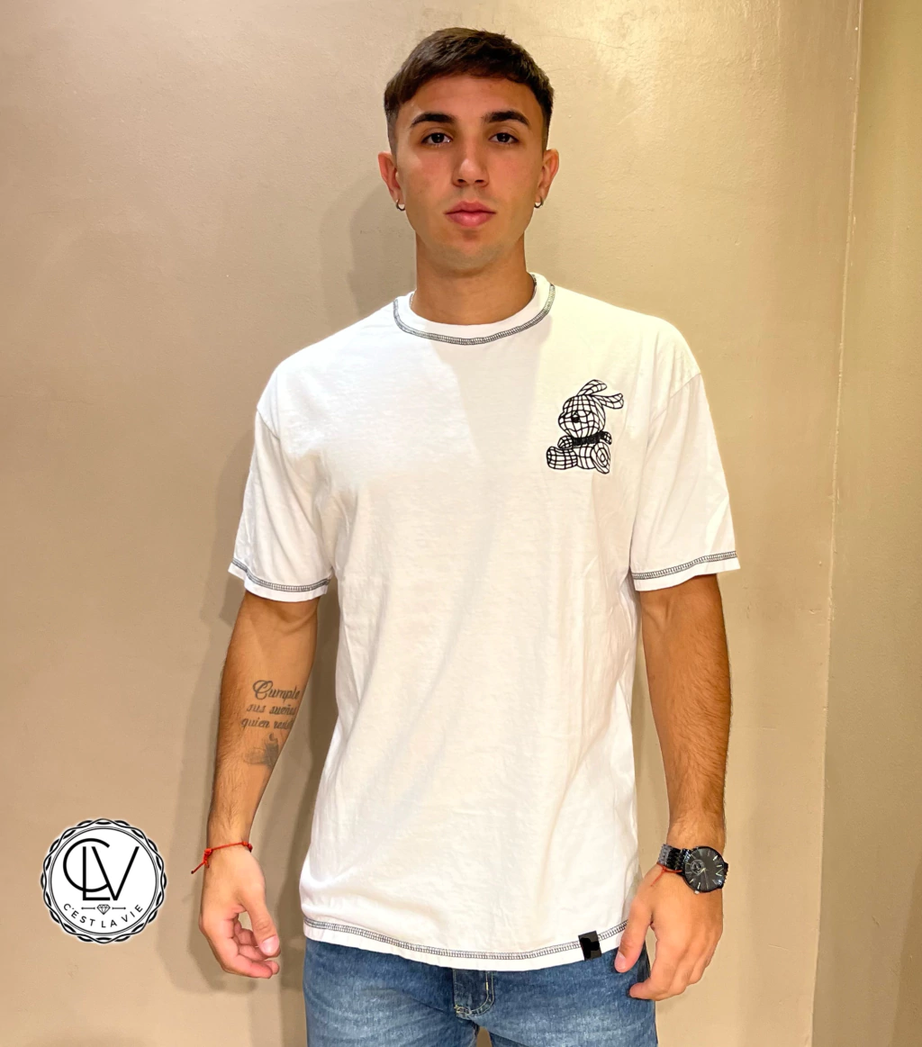 Remera de algodón BlancaCorte Oversize! Con Las Costuras en Hilo NegroFrente con Estampa BordadaSupper Cómoda y Fachera!!