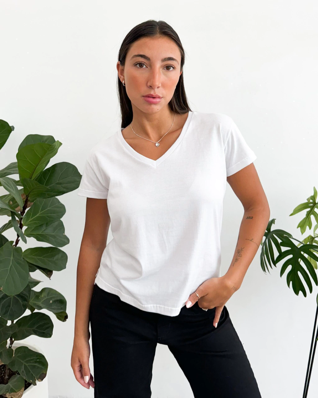LaREMERA CALAes de los productos MÁS VENDIDOS en Turia! La vendemos hace más de 10 años, y esLA BÁSICAque no puede faltar en tu armario si sos fan del escote en V. Súper versátil y atemporal para combinar y usar en cualquier ocasión.CARACTERÍSTICAS Y DETALLES:Tiene escote en V, con mangas cortas, y la espalda es un poco más larga que el delantero. Tiene tajitos en los laterales que le dan un toque más canchero.MATERIAL Y COMPOSICIÓN:Confeccionada en jersey100% algodón, súper suave y de alta calidad.*los colores grises contienen un pequeño porcentaje de poliéster para generar el efecto melange*BENEFICIOS Y VENTAJAS:El jersey de algodón es una tela que te hará sentir cómoda y fresca durante todo el día. Su uso es ideal para cualquier estación del año, ya que es excelente para regular la temperatura corporal, manteniendo el frescor en climas cálidos y proporcionando calidez en climas fríos.ESTILOS Y USOS:Nuestra REMERA CALA es esa prenda queno puede faltar en nuestro armario. Es súper versátil y atemporal para usar en una variedad de situaciones. Desde su usodiario y casual, combinándola con pantalones, shorts o faldas. En forma decapas, por debajo de prendas más arregladas y así darle un toque más relajado al look. O comocapa base en climas fríos.También se puede usar con ropa paraestar en casao parahacer deporte. Estas son sólo algunas ideas de uso, ¡pero hay muchas más!TALLES:S, M y LMEDIDAS DE LA MODELO:Busto: 88 cmCintura: 64 cmCadera: 89 cmAltura: 1,58 mtsCUIDADOS DE LA PRENDA:Al ser una prenda confeccionada en un tela de fibra natural, esideallavarla a mano y con agua fría.En caso de usar lavarropas te recomendamos lo siguiente:1-Dividir las prendas por colores similares. Claros por un lado, oscuros por otro.2-En lo posible, girar las prendas del revés para proteger colores y estampas en caso de tener.3-Usar agua fría o tibia, que no supere los 30º de temperatura. El agua caliente puede hacer que la prenda se encoja.4-Evitar uso de suavizantes, ya que pueden dejar residuos en el algodón.5-Para el secado, lo ideal es una vez terminado el lavado, colgar las prendas en un tender. En lo posible, evitar centrifugado con secadora. En caso de usarla, ajustar a la temperatura más baja que lo permita, y retirar las prendas cuando todavía estén ligeramente húmedas para evitar el exceso de secado.6-Guardar preferentemente doblada.