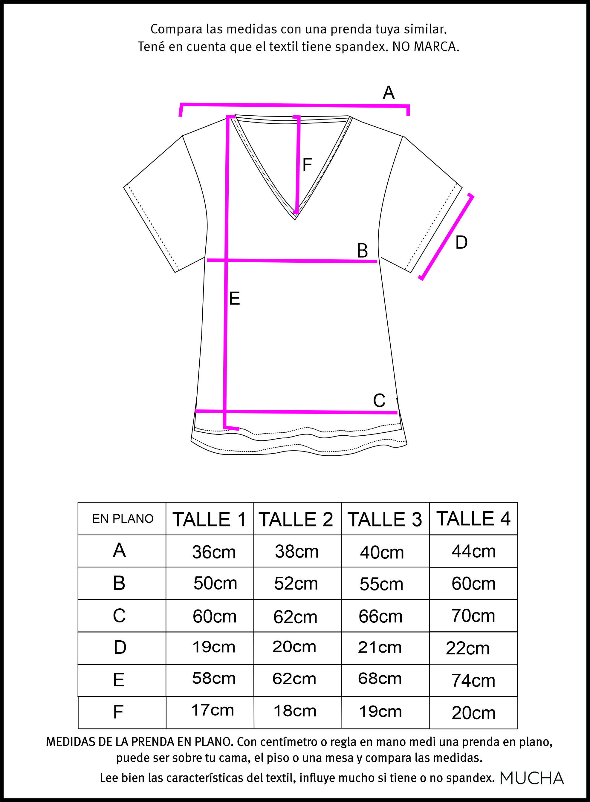 Medidas: Tomamos las medidas de la prenda en plano, Tené en cuenta que es una remera que queda linda que contenga en la zona del busto.