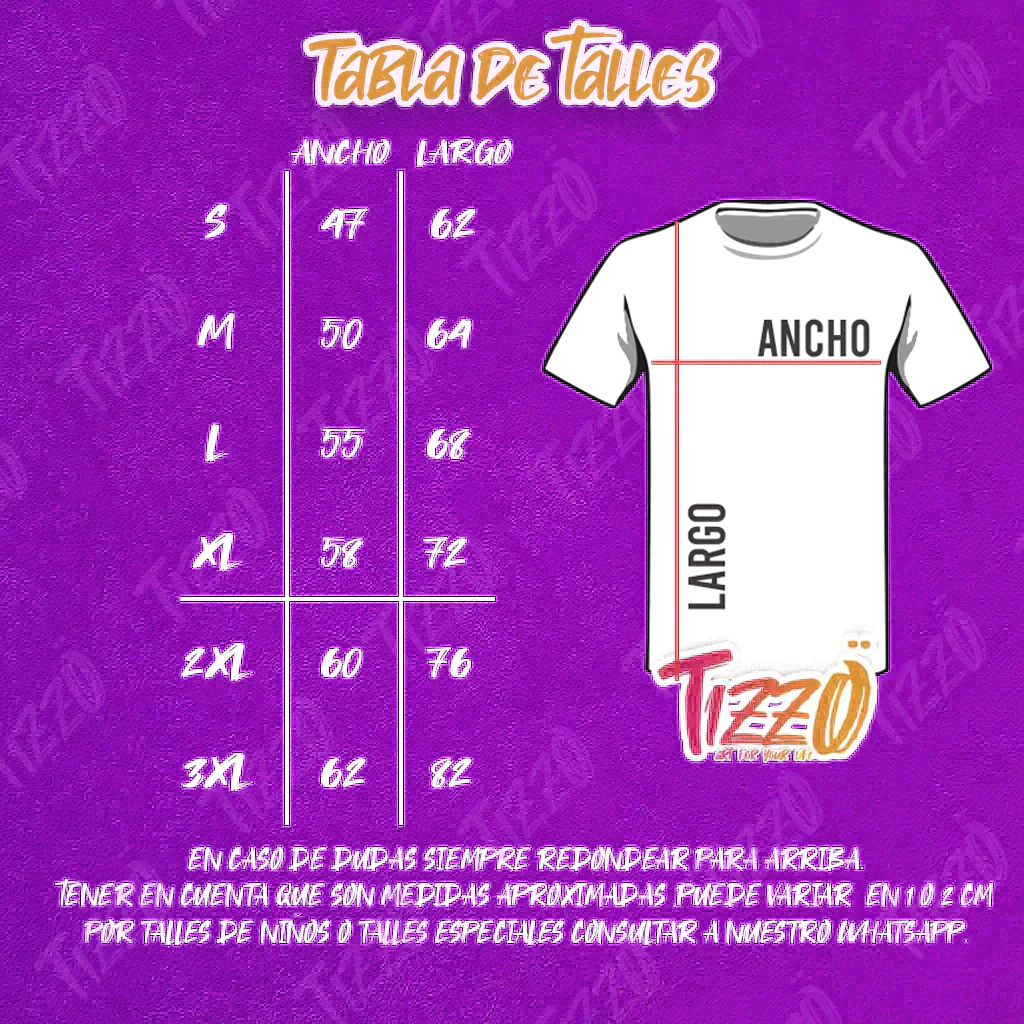 REMERAS TIZZORemeras de ALGODÓN no encogen con los lavados.Estampadas por impresion DTF.Talles S al XXXLEnvíos a todo el país.Las prendas compradas son en modalidad a pedido , por lo que recomendamos revisar la tabla de medidas para evitar errores en el talle escogido.ATENCIÓN:LAS ENTREGAS ESTARÁN PARA DESPACHARSE AL CORREO ENTRE LoS 2 A 5 dias HABILES  (tiempo estimado de producción).