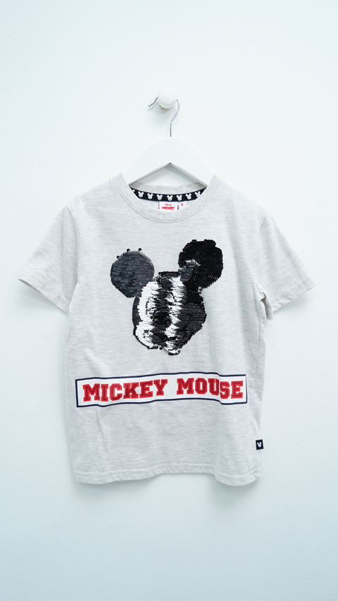 Remera algodón. Tono gris melange. Lentejuelas reversibles motivo Mickey Mouse. Estampa en frente. Escote redondo.Manga corta.Medidas: Ancho de hombros: 29 cm. Contorno de pecho: 68 cm. Largo total: 46 cm.Marca:DisneyTalle:8 AñosComposición:100% AlgodónEstado:Excelente¿Tenés dudas con el talle? Seguí nuestras recomendacioneshttps://www.tiendacocoliche.com/guia-de-talles/