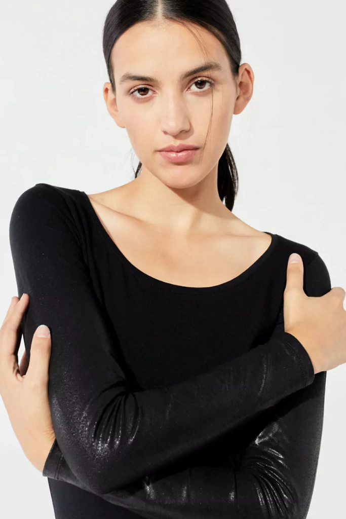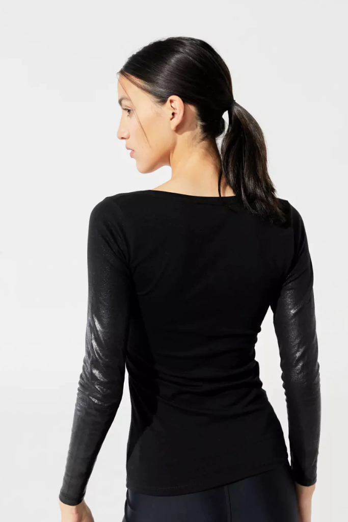 Remera manga larga confeccionada con algodón con lycra. Silueta slim fit. Cuello escotado en hombros. Largo primera cadera. Detalle en manga de foil en degrade.