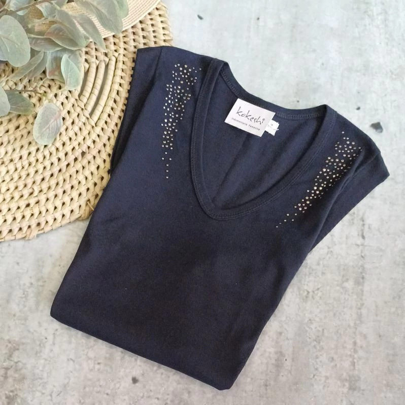 Remera de algodón sin manga, escote V con tachitas doradas en laterales