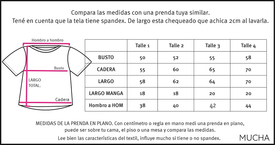 Medidas DE TU CUERPO, elegí el talle que mas se adapte a tu gusto. Compara una prenda tuya con las medidas de la tabla, tené en cuenta el largo. Ya chequeamos que acorta 2cm al lavarla.