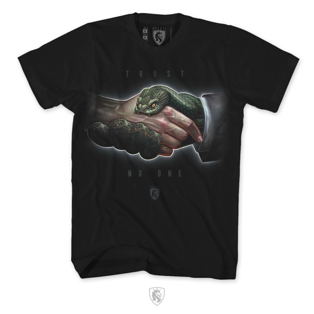 - "Handshake With Snake" Impresión a todo color en la parte delantera, impresión pequeña del mismo diseño en la parte superior central trasera.