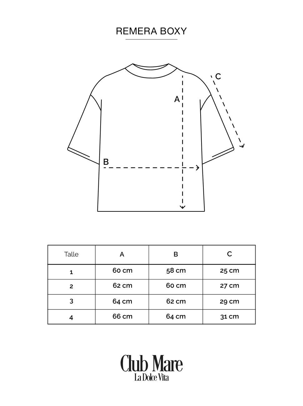 Talle 1: ancho 58 cm, largo 60 cm, manga 25 cm