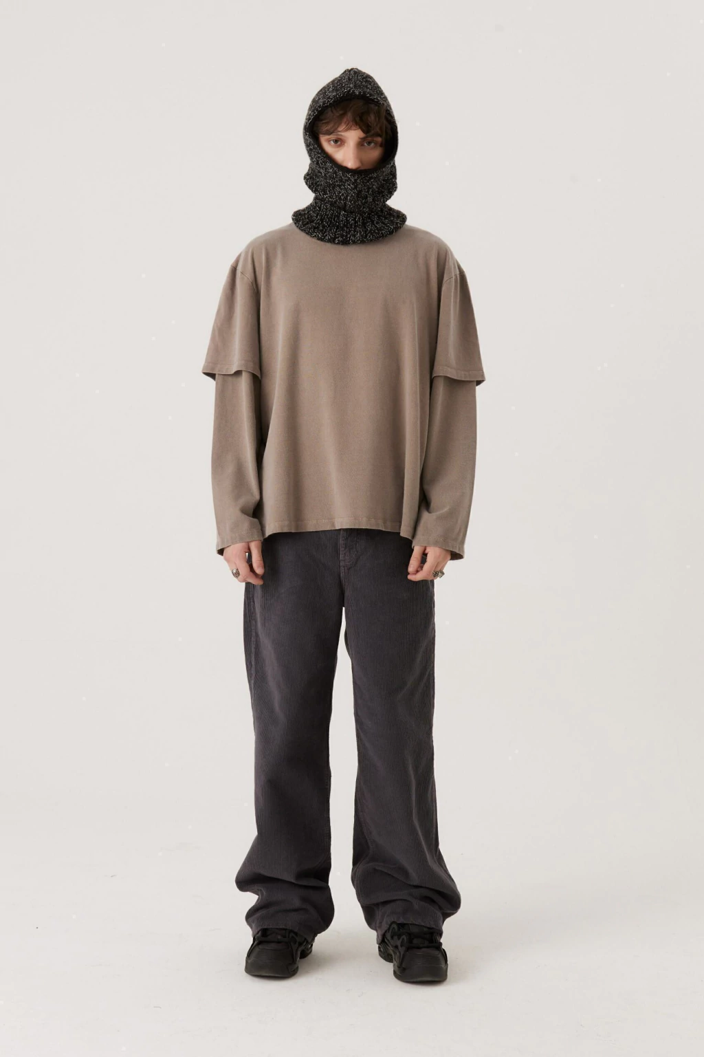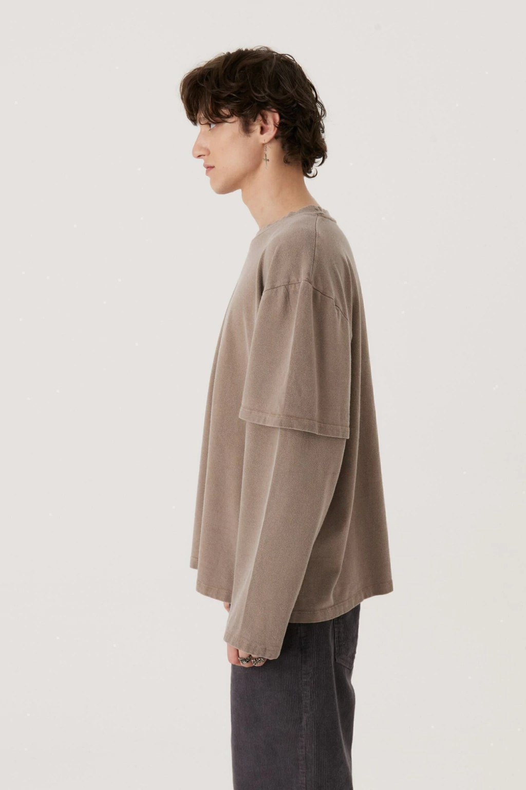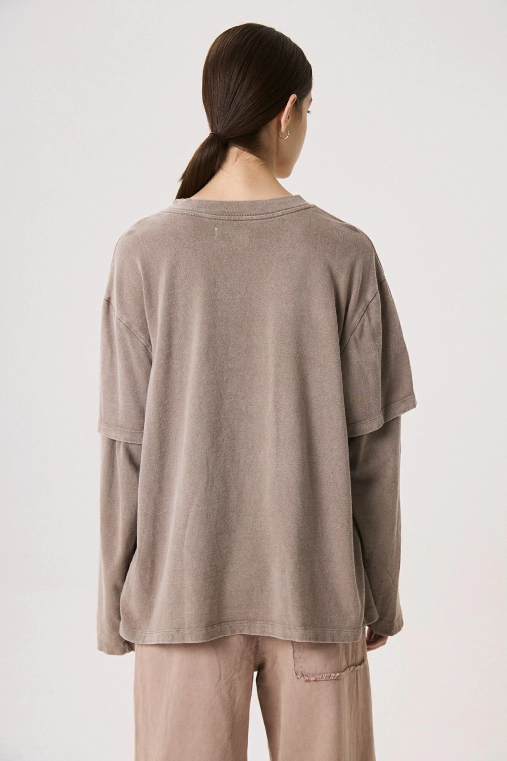 Remera doble manga, teñido color tierra. Largo a segunda cadera y silueta amplia. Bordado en delantero.