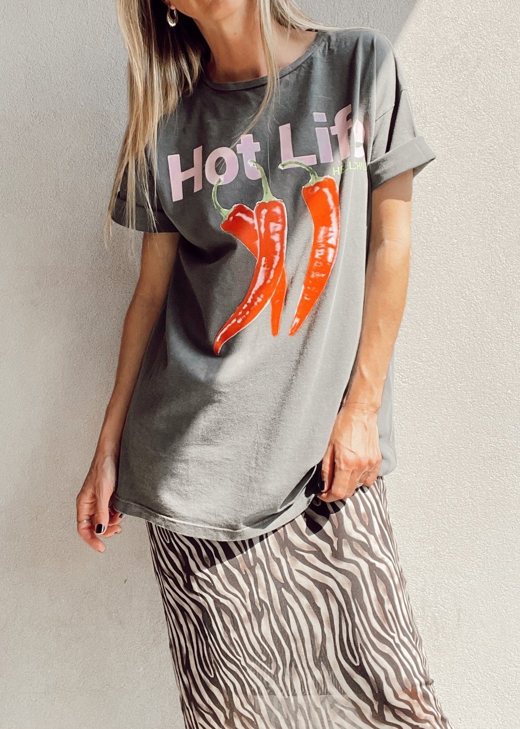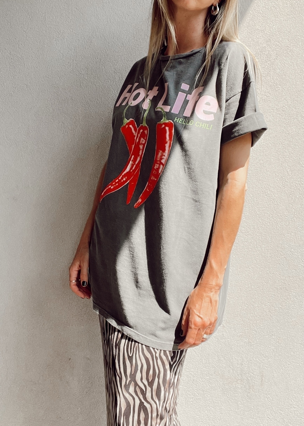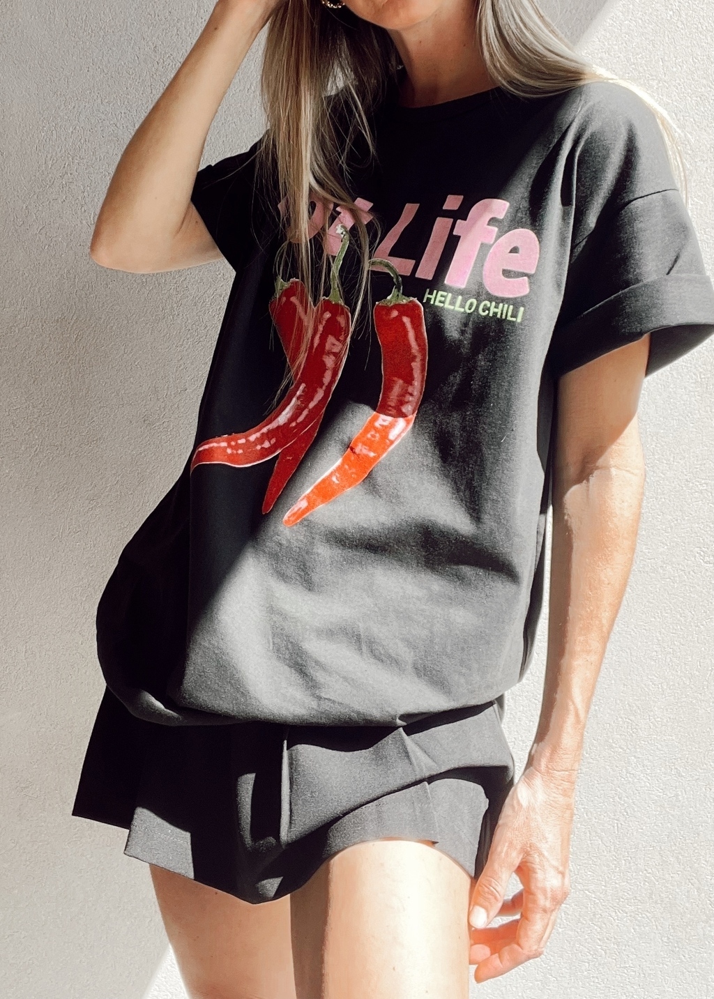 Maxi remerón cuello redondo, manga corta, con estampa al frente. "HOT LIFE hello chili".