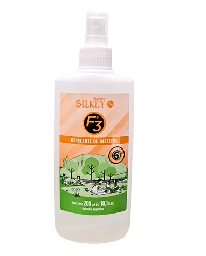 SILKEY F3 REPELENTE DE INSECTOS 200ML 6HS X3Repelente de insectos silkey duracion 6hs, DEET 7 %MODO DE USO - Aplique un apequeña cantidad de liquido sobre la piel sana pulsando el atomizador a 15cm de la zona a proteger. Para aplicar en la cara o cuello, rocie en la palma de la mano y disperse suavemente evitando ojos y labios.PRECAUCIONES - Mantener fuera del alcance de los niños