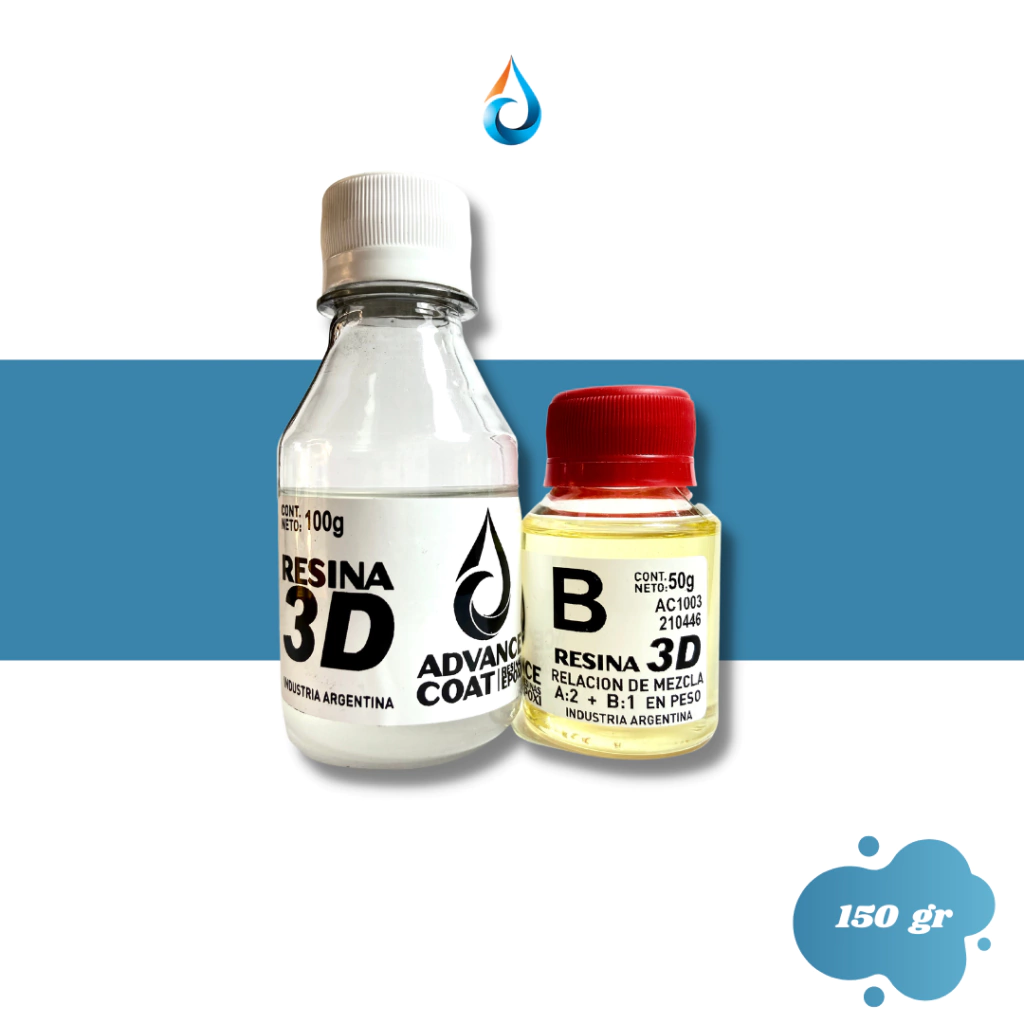 HECHA PARA APLICAR SOBRE IMPRESIONES 3D CON PINCEL.Presentación de 150 GramosComponente A: 100 Gramos / Componente B: 50 GramosComponente A Resina y Componente B Endurecedor/Catalizador.Características Principales:Ideal para cubrir impresiones 3D de PLA.Relación de mezcla 2 a 1 en peso.Tiempo de curado 24hs.Dureza 85 Shore d.Cómo usar la resina