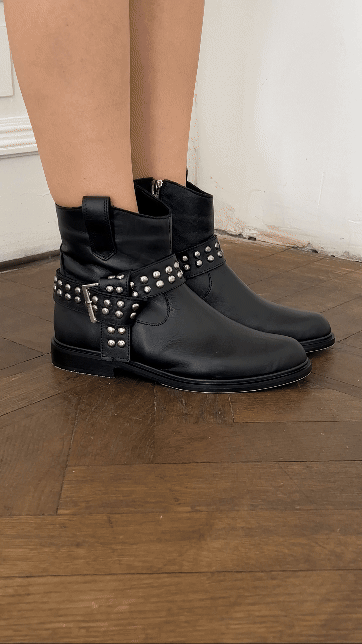 *Botas de caña corta con cierre lateral interno, estribo fijo con tachas y hebilla.