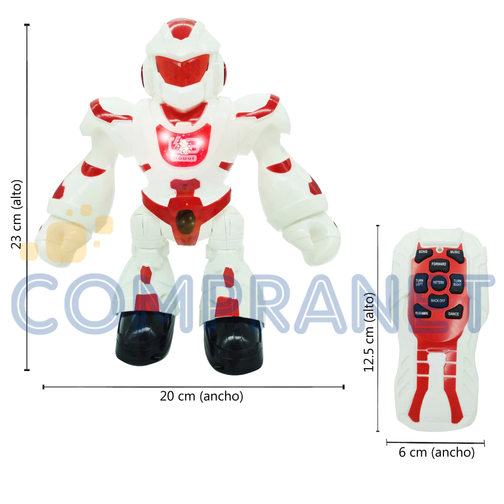 Robot Dance Inteligente a Control Remoto que avanza hacia adelante, hacia atrás, gira a la derecha y a la izquierda. Posee funciones “Song”, “Music” y “Dance” con las que el robot baila al ritmo de diferentes canciones.Con cada movimiento el robot enciende luces en los ojos y el pecho, y emite variados sonidos.Súper divertido para los mas chicos, este robot bailarín. Posee botón ON-OFF.Con ruedas en los pies del robot que mejora la movilidad.Funciones:•Forward: realiza 8 pasos hacia adelante.•Back Off: realiza 8 pasos hacia atrás.•Turn Right: Realiza 1 giro a la derecha.•Turn Left: Realiza 1 giro a la izquierda.•Song: El Robot baila al ritmo de la música.•Music: El Robot baila al ritmo de la música.•Dance: El Robot baila al ritmo de la música.•Pattern: El robot para los movimientos.•Programing: Presionando el botón se pueden programar los movimientos del robot.Material: Plástico.En Caja. El robot utiliza 3 pilas AA (No incluidas).Colores: Azul y Rojo.Para niños mayores de 5 años.Permite el desarrollo de la interacción entre los niños, estimula la imaginación, la comunicación y la capacidad de pensamiento. Desarrolla las habilidades motoras, de coordinación, movimiento, equilibrio y creatividad.Medidas del Robot: 20 cm (ancho) x 23 cm (alto)Medidas de la Caja: 25 cm (ancho) x 26 cm (alto)