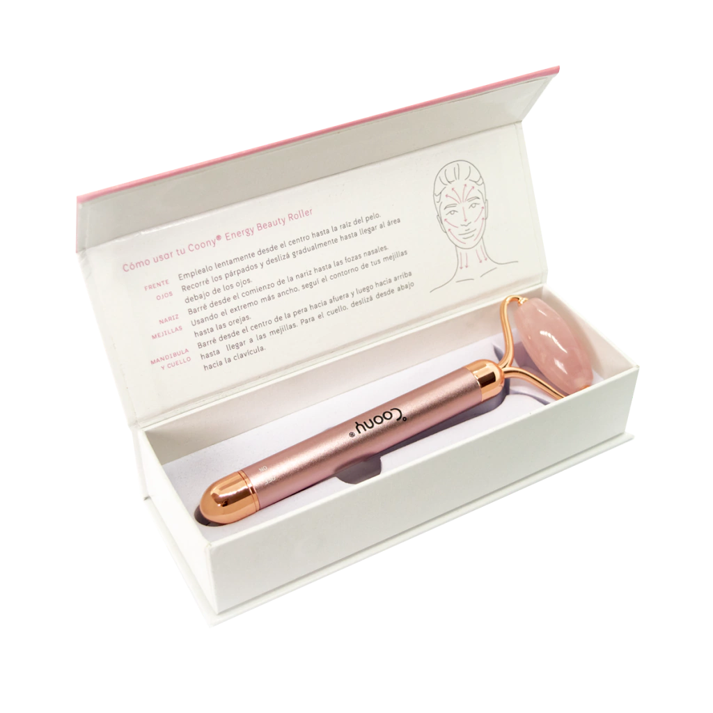 Contiene 1 Rodillo Facial de Cuarzo Rosa Eléctrico, efecto vibrador. Piedra natural de máxima pureza.