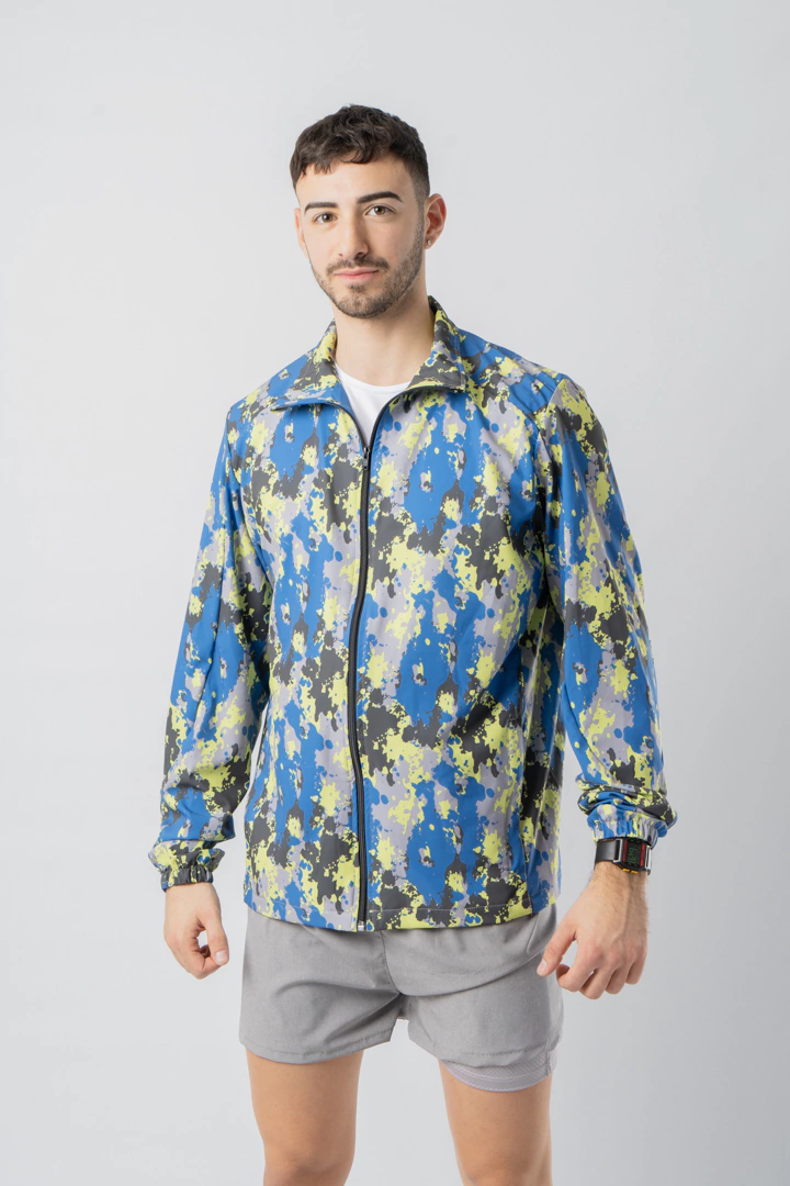 Rompeviento sublimado, con aireación en la espalda, tira reflectiva y bolsillos con cierre.
