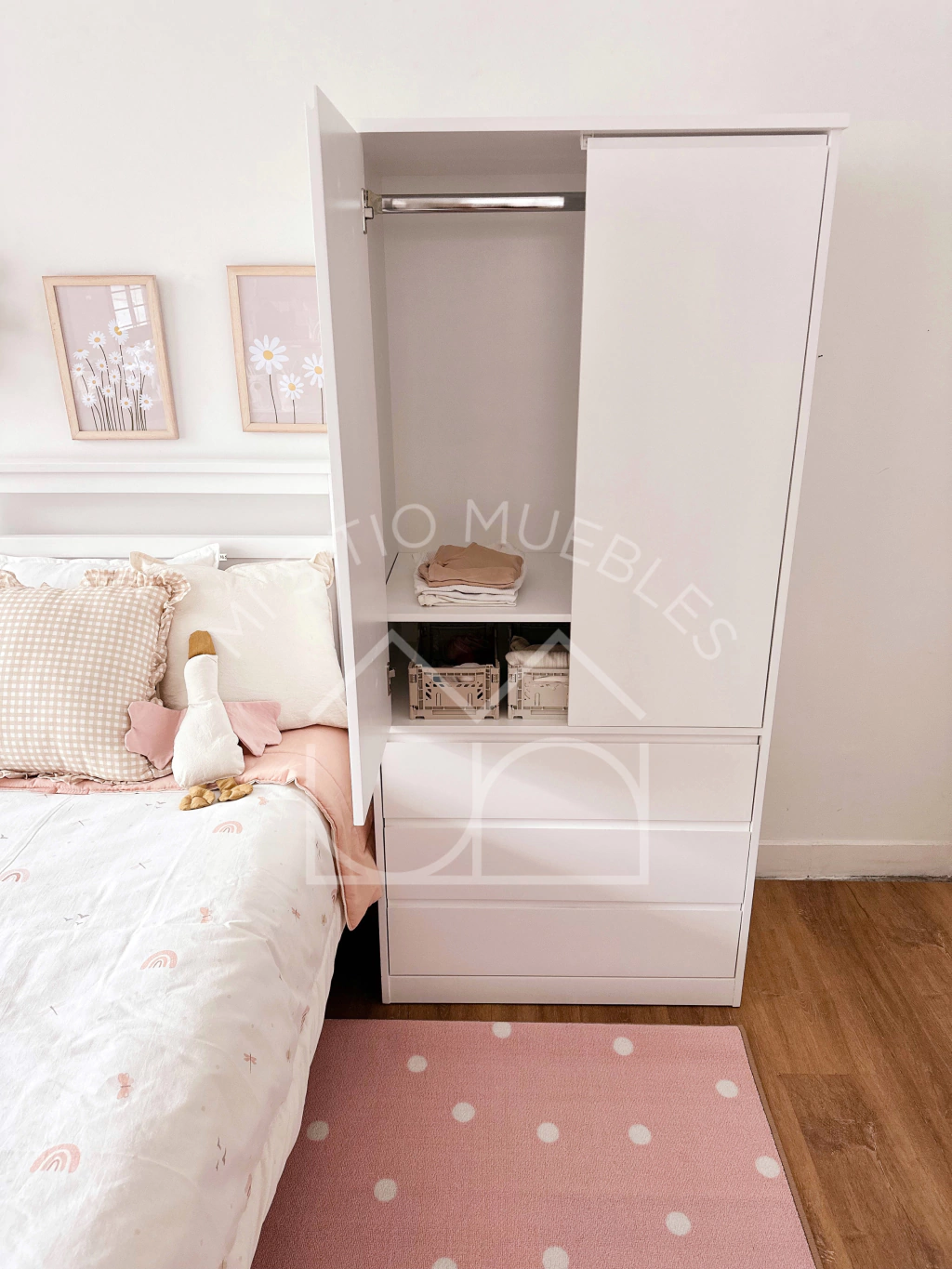 La solucion mas simple al guardado de ropa. De lineas rectas y simples este ropero ofrece gran capacidad de guardado. Con 3 amplios cajones, estante y barral para colgar. Se adapta a cuartos de bebes, chicos y teens.