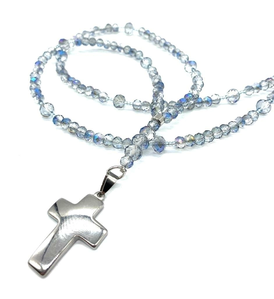 Rosario confeccionado en Cristal de roca de 8 y 6 mm color gris tornazolado transparente y dije Cruz en Acero Quirúrgico macizo de 3 cm x 2 cm..