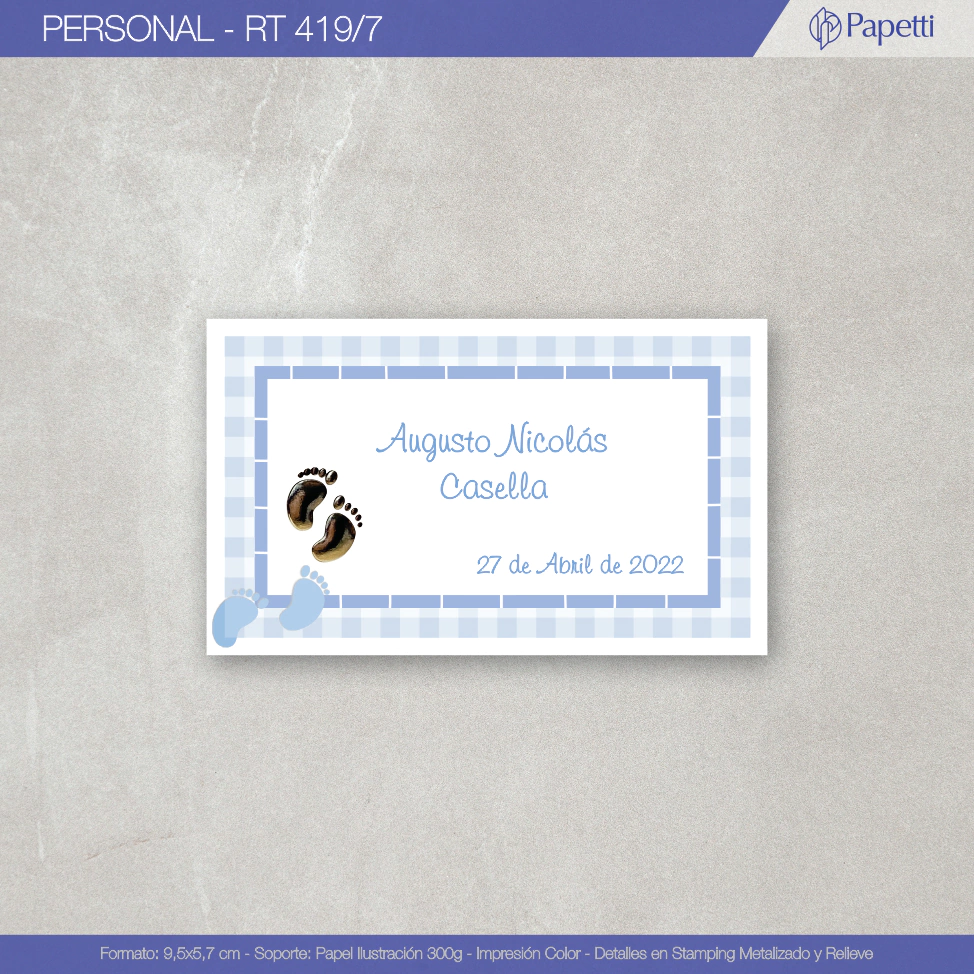 Tarjetas Individuales de Nacimiento Modelo RT 419/7Pack x 25 unidadesFormato Simple (medida 9,5 x 5,7 cm)Papel Ilustración 300gDetalles en Relieve*El precio incluye personalización de texto