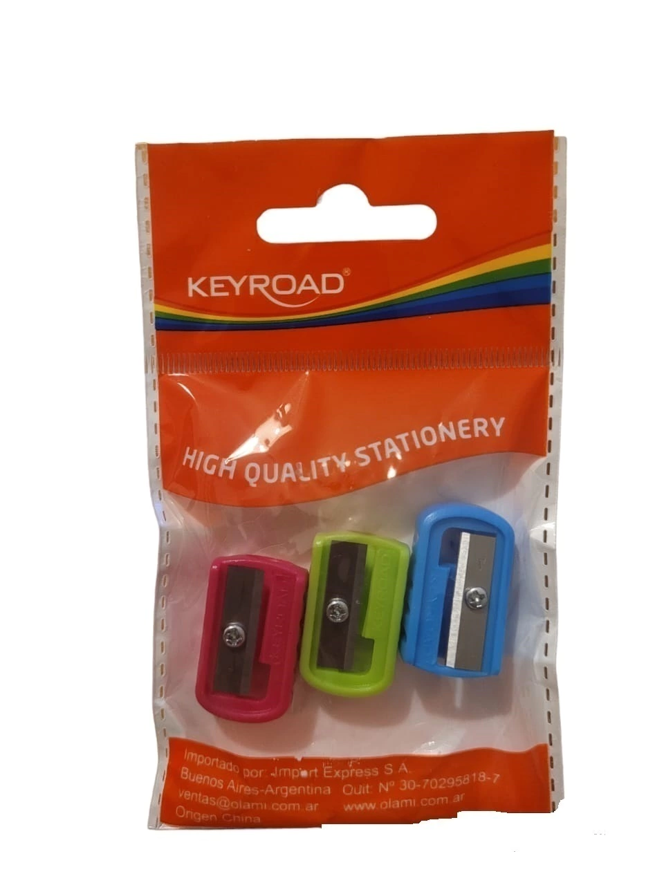 Sacapuntas escolar KeyroadPack x 3 unidadesColores: Verde, celeste y rosa.Hoja de acero. Cuerpo de plástico.