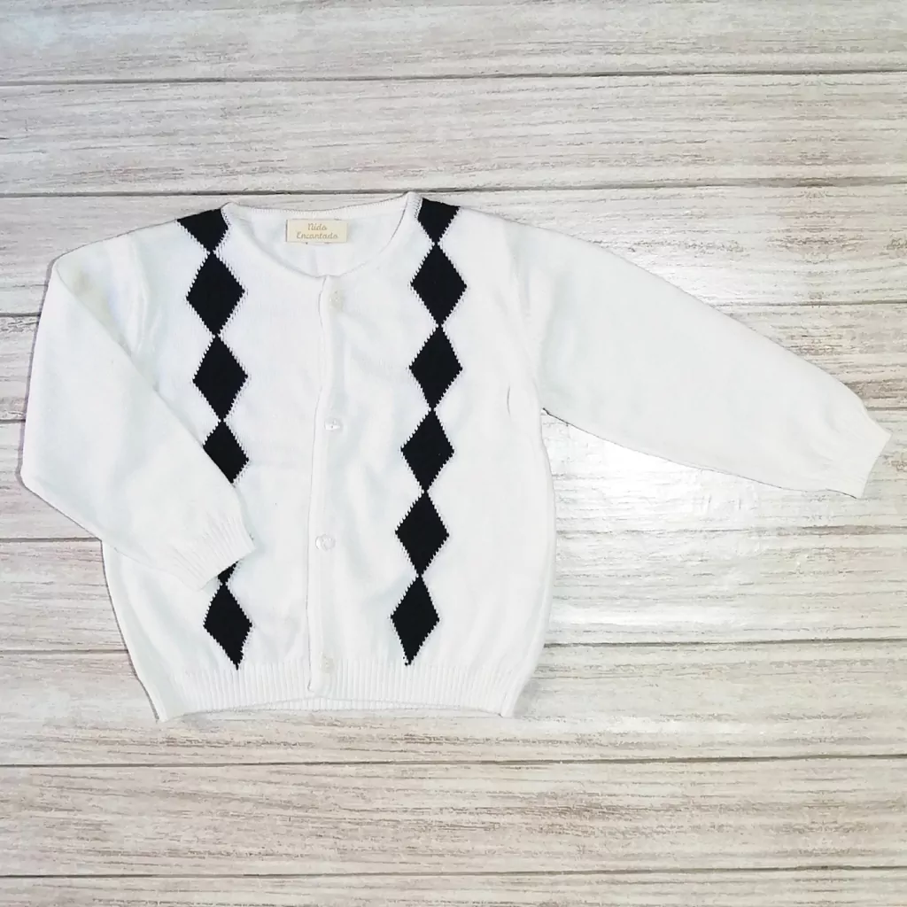 saco tejido en hilo de algodòn livianito, en tono blanco con rombos en negro.una prenda super delicada para completar los outfits de tu bebè.guìa de talles en la ùltima foto.